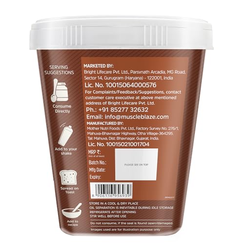• EXOTIC DARK CHOCOLATE: Relish the taste of exotic dark chocolate in MuscleBlaze High Protein Peanut Butter. Delectable dark chocolate meets nutritious and crunchy peanut butter to give you a heavenly experience of snacking