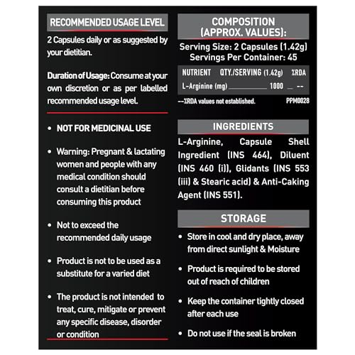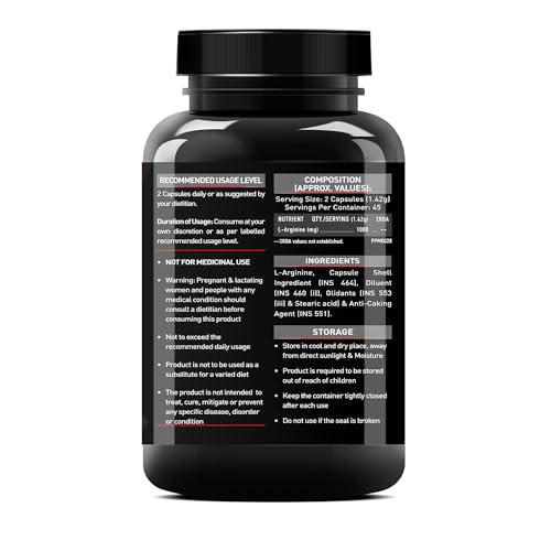 • RECOMMENDED DOSAGE: Consume one MuscleBlaze L Arginine capsule every day with a glass of water or as recommended by your dietician. The best time to consume L Arginine capsule is in between meals or before bedtime. Do not take more than two capsules a day