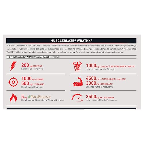 • PRE WORKOUT SUPPLEMENTS FOR MEN & WOMEN: The all-new MuscleBlaze WrathX is the ultimate pre-workout mix to give you an advanced level of performance that you have never witnessed before. It is powered with a unique combination of Caffeine EnXtra and Thean