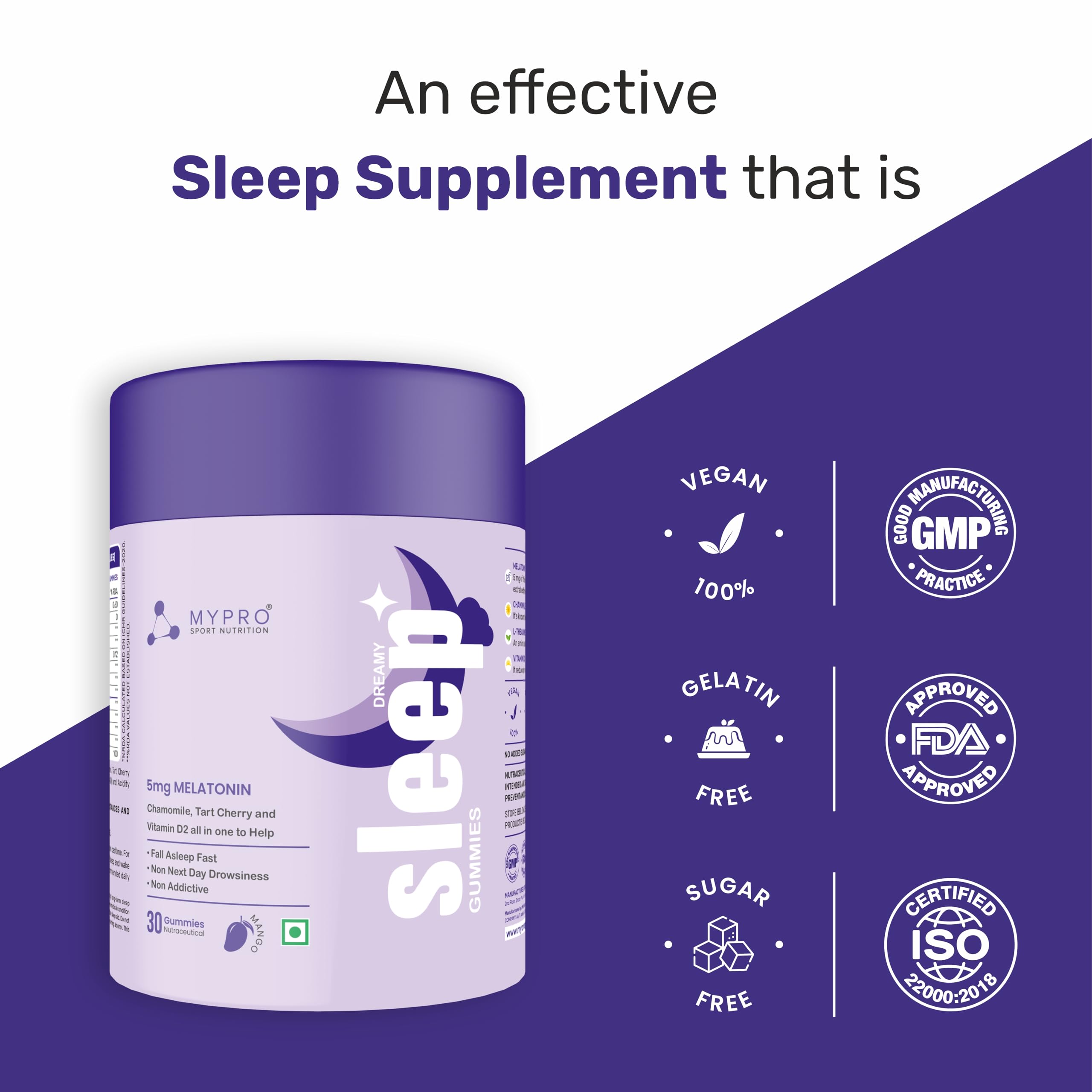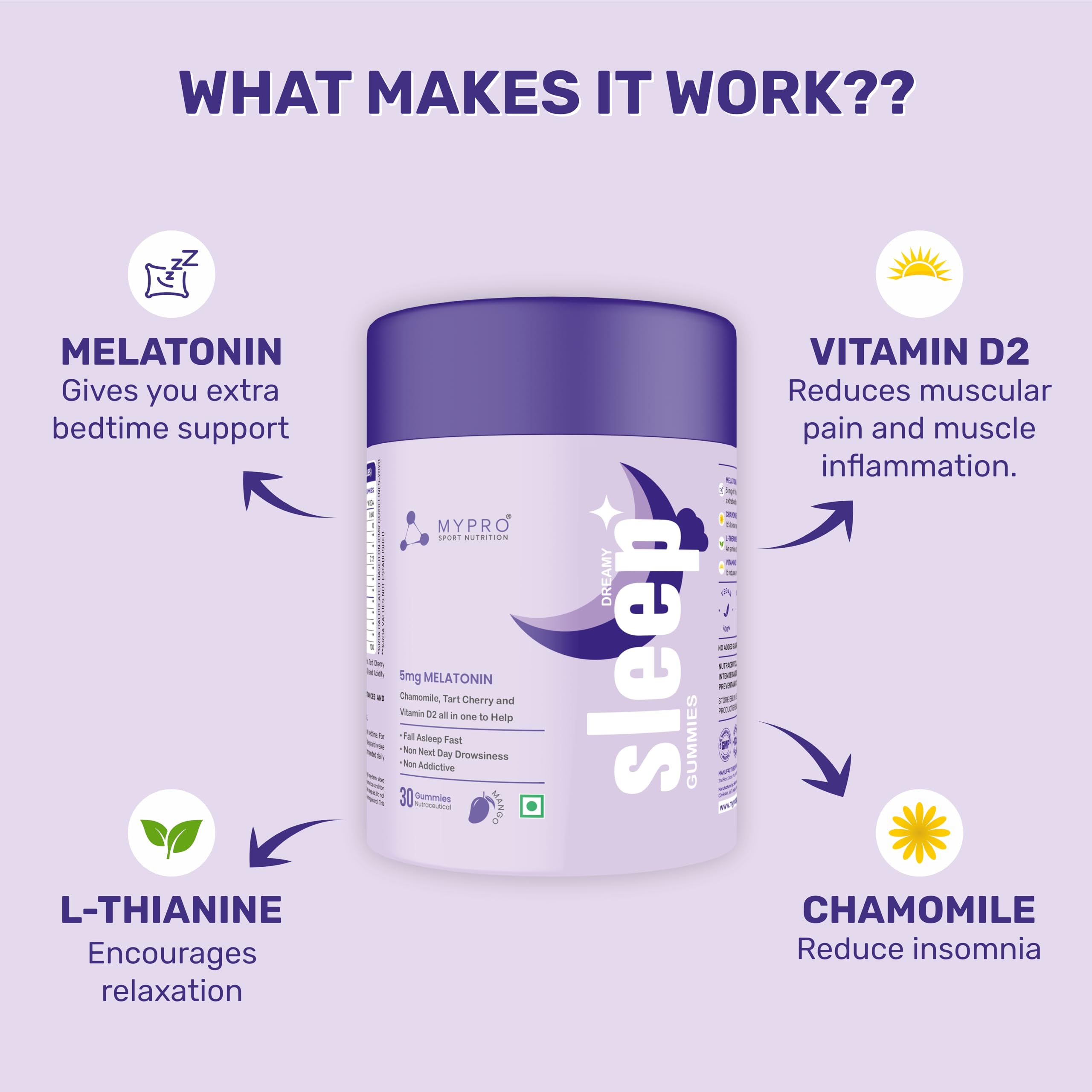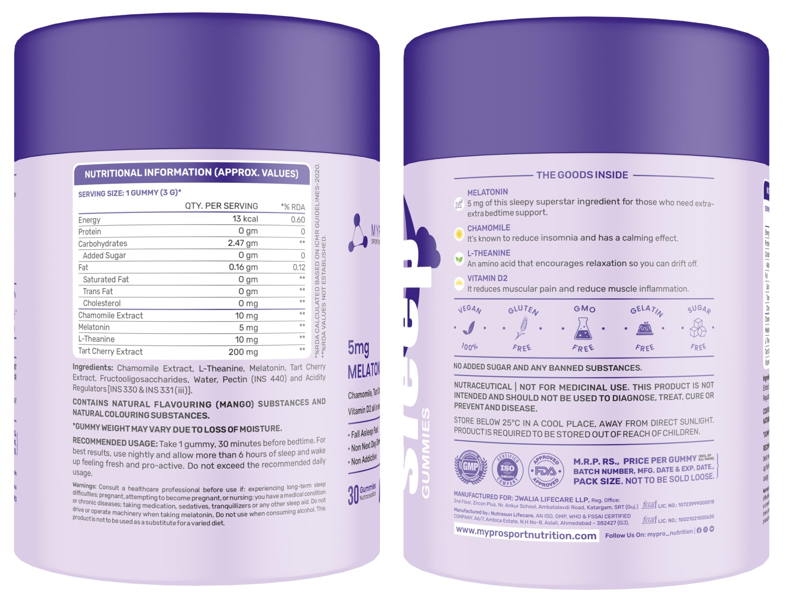 Mypro Sport Nutrition Sleep Gummies have a special combination of active substances that combine to relax your muscles and promote restful sleep so you wake up feeling rejuvenated. These melatonin gummies which also contain L-Theanine botanical extracts such as chamomile and tart cherry and vitamin D2 work with your body to promote restful sleep muscular recovery and a reduction in stiffness and soreness. Our 5mg Melatonin Gummy helps in sleep by being naturally Mango flavored with mango extracts.