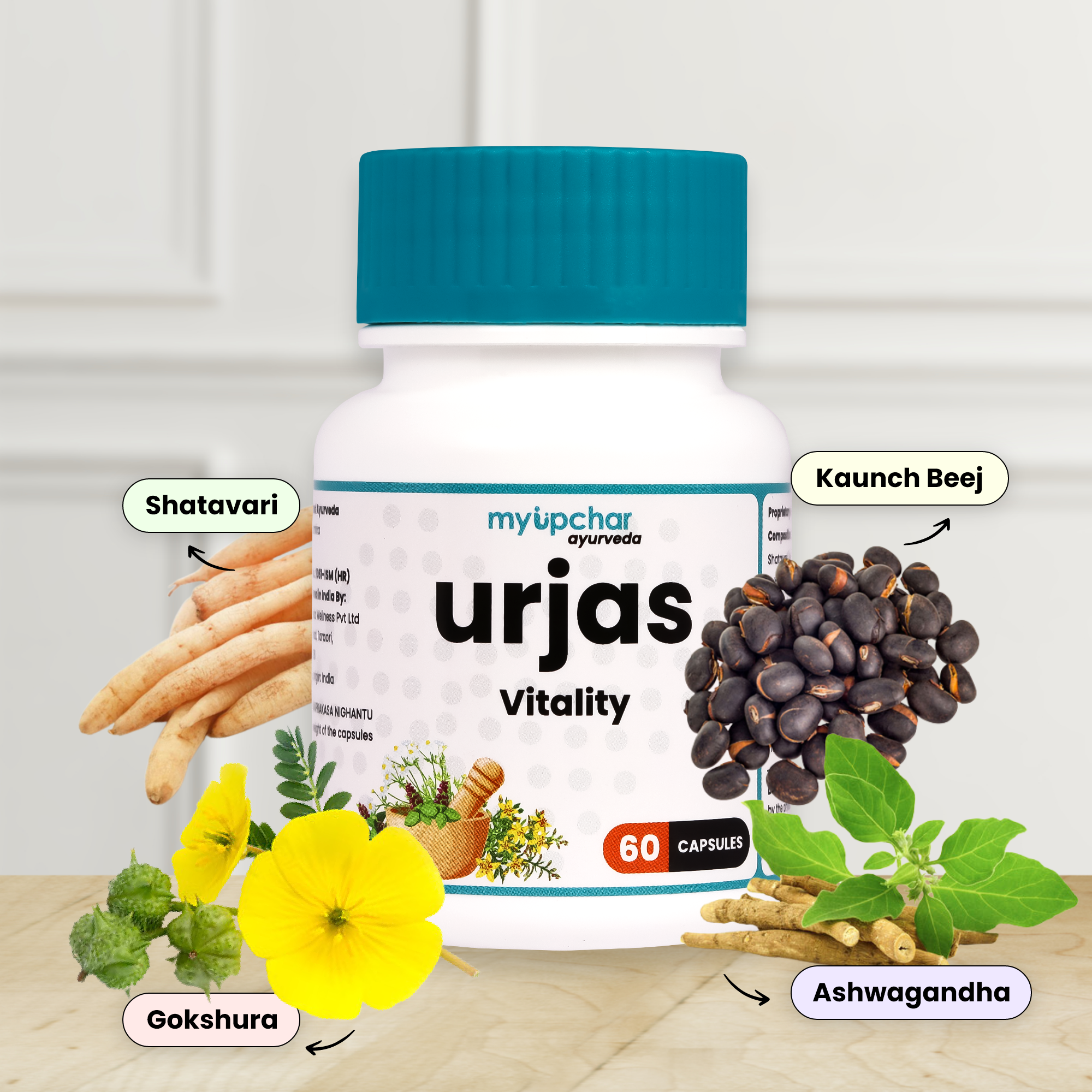 myUpchar Ayurveda Urjas Vitality Caps. For Men | Improves Strength, Stamina & Energy | , Safed Musli, Gokshur & Shjilajit | 60 Veg Caps.