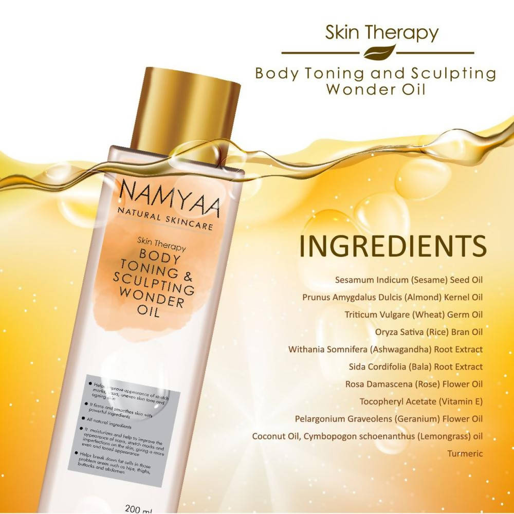 Namyaa Body Toning and Sculpting Wonder OilKey Ingredients:Sesame Seed OilAlmond Oil, Wheat Germ OilRice Bran OilAshwagandhaBala Root ExtractsVitamin ERose OilCoconut OilLemongrass OilTurmeric OilSaffronDirections of use:Take some amount of oil on your hands and apply it directly on the parts of the body, i.e. hands, legs, and anywhere you need to help moisturize and revive dry skin kinds.Gently massage it with the help of your palms till the oil gets completely absorbed in the skin.Use it on a daily basis for maximum benefits.Legal Disclaimer: Statements regarding dietary supplements have not been evaluated by the FDA and are not intended to diagnose, treat, cure, or prevent any disease or health conditionNote: The product is guaranteed to be 100% genuine. Product images are for illustrative purposes only. Images/packaging/ labels may vary from time to time due to changes made