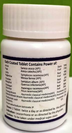 Each coated Tab.. contains - Ashok 50mg, Lodhra 50mg, Majufala 50mg, Shatawari 50mg, Nagkeshar 50mg, Puga 25mg, SwetaChandan 25mg, Udumbar 25mg, Kukutandaktwak bhasm 25mg, Pradrantak lauh 25mg, Trivang Bhasm 25mg.