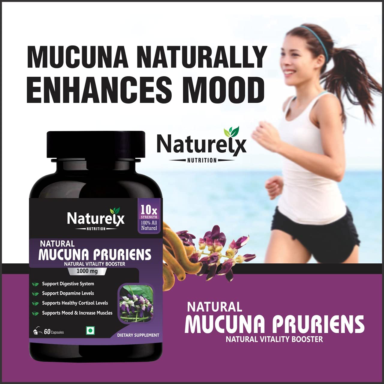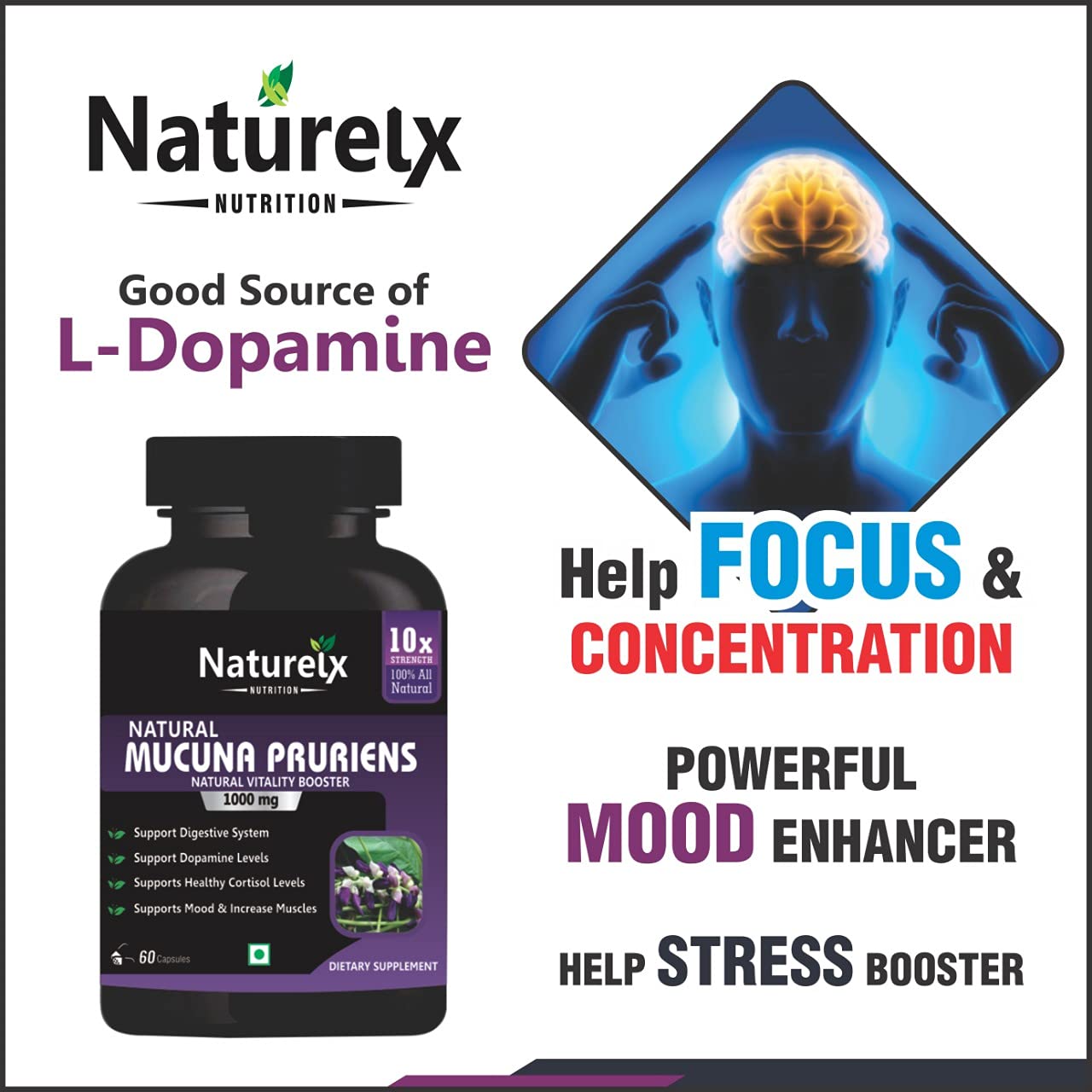 10X Stronger - Made using high potency extracts stresses of modern life the benefits of taking mucuna pruriens capsules can include a significantly positive effect on their mood. It is in fact often described as a natural nootropic. Research shows the L-dopa in mucuna pruriens powder increases dopamine in the brain cortex. Many people report mood enhancement and elevated alertness.