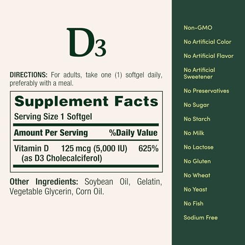 A daily dose of Naturel Bounty Vitamin D3 is a simple and effective way to show your immune system some love. (1) As a more potent form of Vitamin D Vitamin D3 is an essential nutrient for immune support that may assist the immune system by helping to regulate T and B-lymphocytes (cells that major components of your immune response). (1) While Vitamin D is known as the âsunshine vitaminâ many people donât get enough of it due to working and living indoors. Natureâs Bounty Vitamin D3 provides 125 mc (5000 IU) of Vitamin D per serving in one easy-to-take rapid-release softgel. For additional wellness benefits Natureâs Bounty Vitamin D3 also helps maintain healthy bones in adults as Vitamin D3 assists the body with calcium absorption. (1) Plus our formula is non-GMO gluten- and sugar-free and contains no artificial colors or sweeteners. Increase your daily intake of this important nutrient from the wellness experts at Natureâs Bounty. (1) These statements have not been evaluated by the Food and Drug Administration. This product is not intended to diagnose treat cure or prevent any disease. (3) Get More With Natureâs Bounty Than Ever Before.