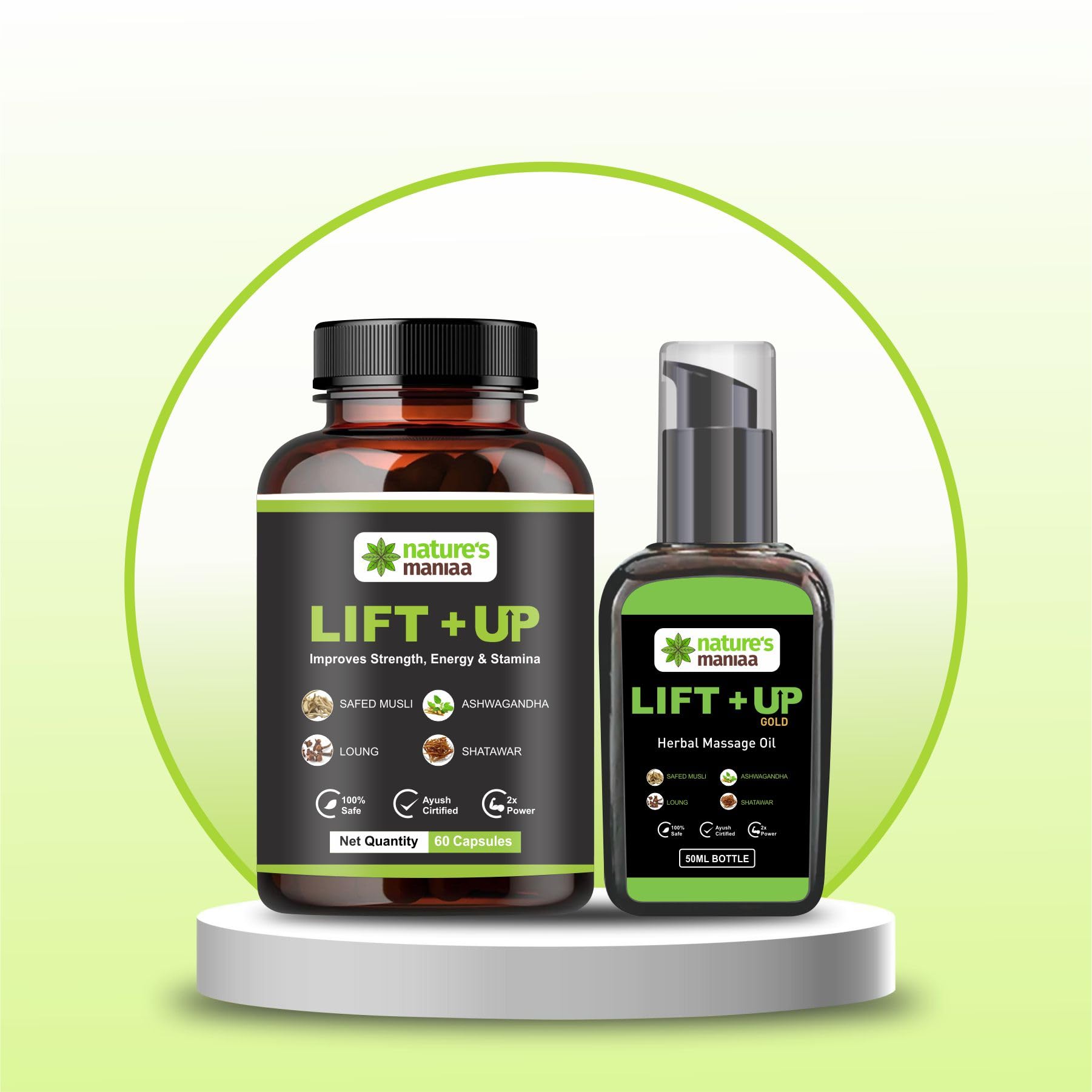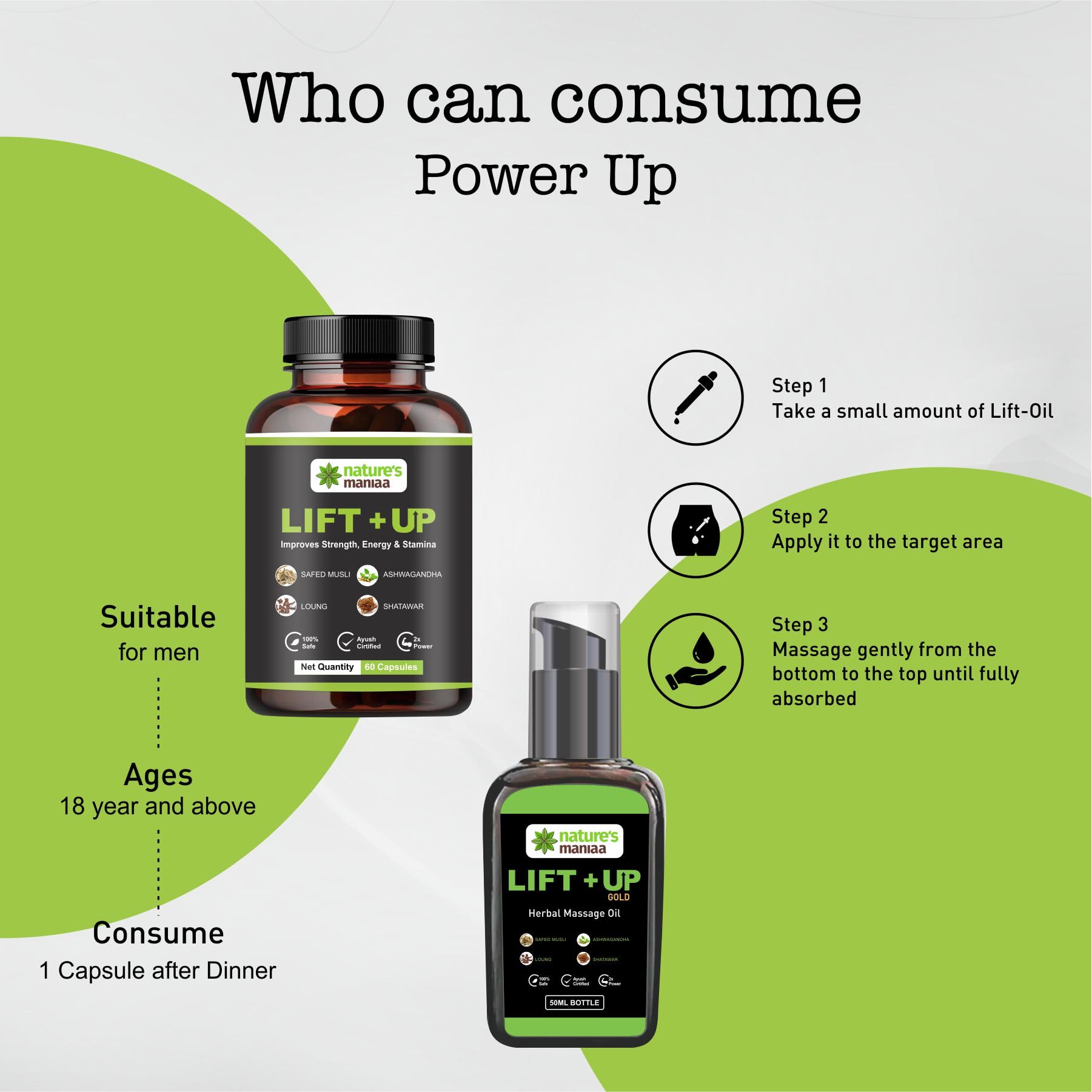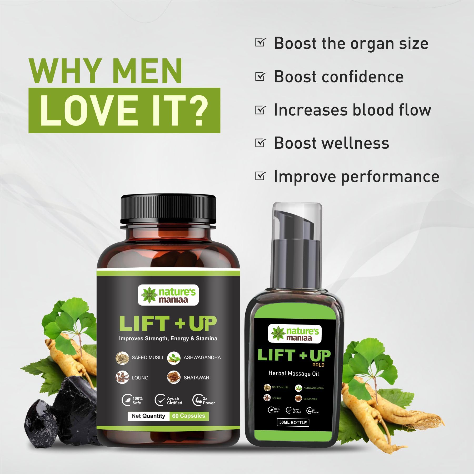 Nature's Mania Lift Up Combo for Men | 60 Capsules (Ayurvedic Male Health Supplement) & 50ml Massage Oil (With Ashwagandha Safed Musli Shatavari Laung Extract) | Ayush Certified & Lab Tested