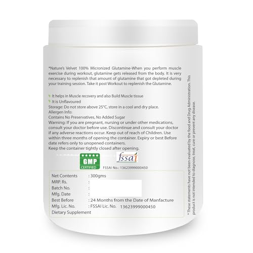 Nature's Velvet Micronized Glutamine-When you perform muscle exercise during workout glutamine gets released from the body. It is very necessary to replenish that amount of glutamine that got depleted during your training session. Take it post Workout to replenish the Glutamine.It helps in Muscle recovery and also Build Muscle tissueIt is Unflavoured. SATISFACTION GUARANTEE: Our Products are manufactured to bring CUSTOMER DELIGHT. NO PRESERVATIVES NO ADDED SUGAR NO GLUTEN NO SOY. PHARMACIST FORMULATED: Our Products are formulated by Pharmacists and manufactured in a FSSAI /AYUSH-approved facility following strict GMP guidelines. We assure the and purity of each batch. INGREDIENTS: Not only is our Product more potent but is sourced from Reputed Manufacturers. We only use pure and raw ingredients in all our formulas.