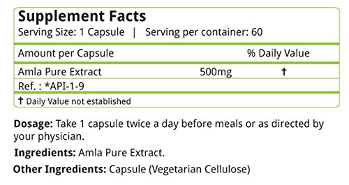 Natures Velvet Amla has 500mg of Pure Extract. It has been formulated as Vegetarian Capsules.Its an ayurvedic Product. It has been manufactured at a GMP certified facility.