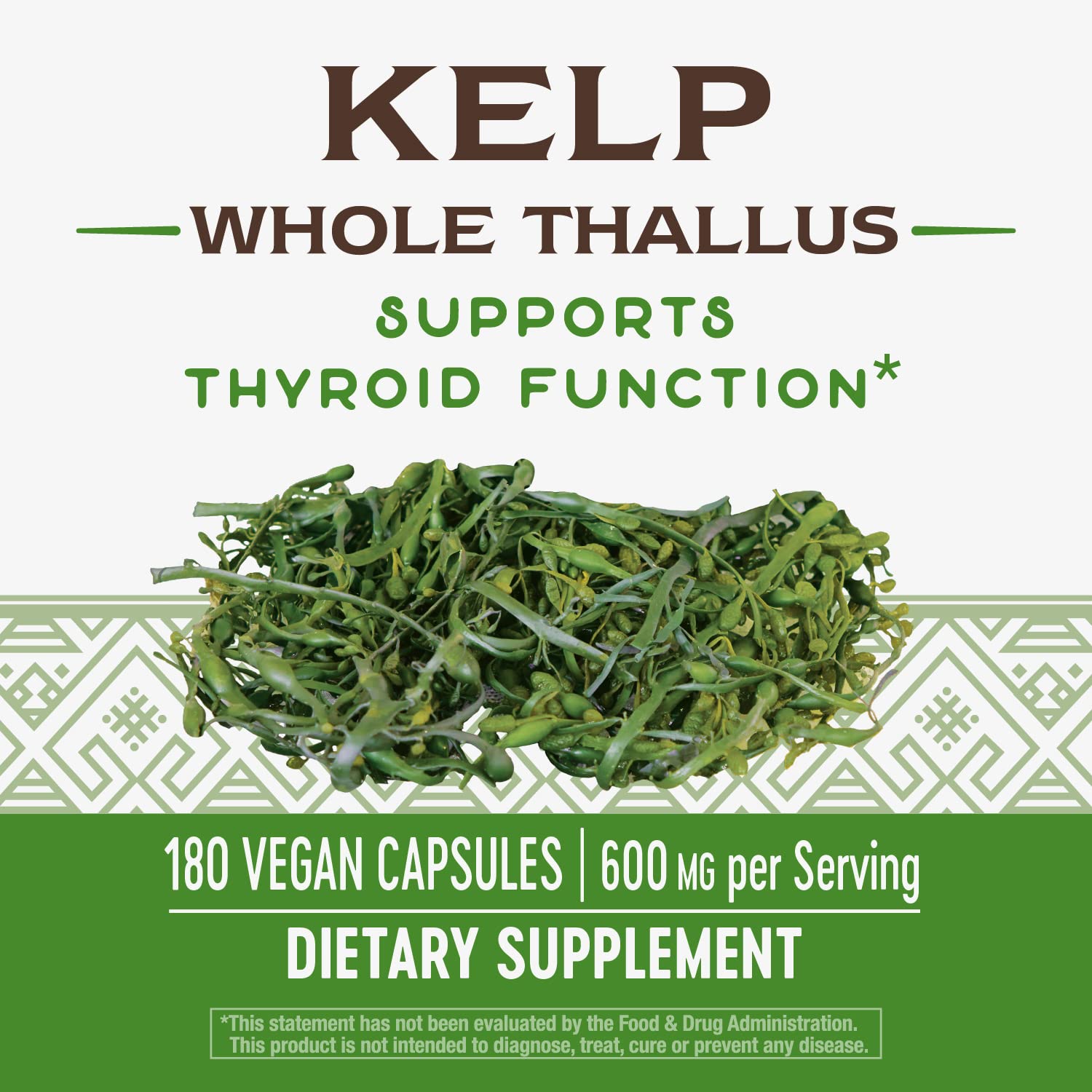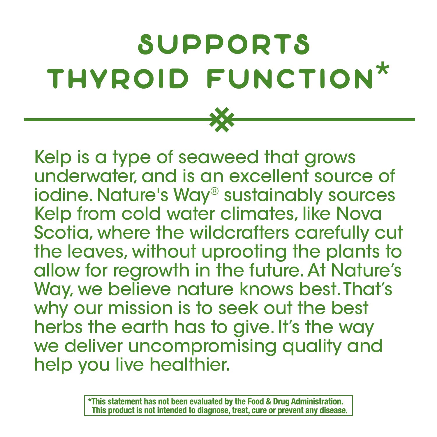 Kelp is a nutritional seaweed. This species of kelp grows in coastal ocean waters from 1 to 10 feet deep with the tide. Nature's way uses whole dried plant to contain 0.06% Iodine.