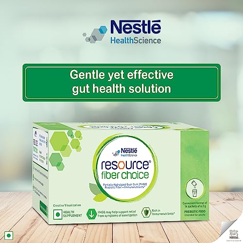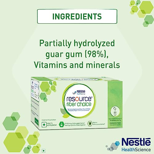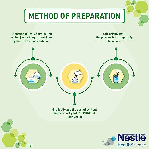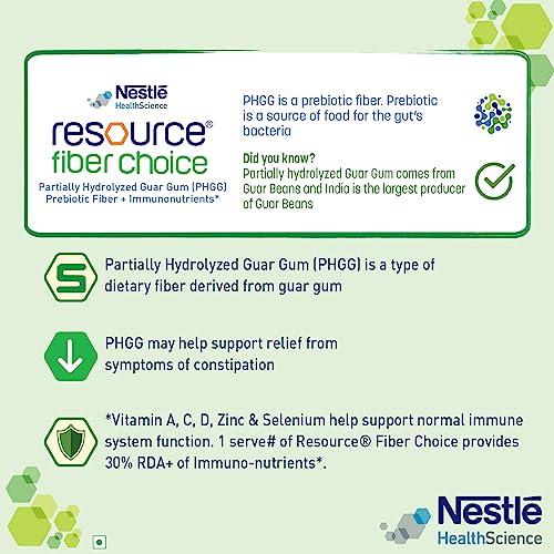 SMART CHOICE FOR DIGESTIVE HEALTH. Make Nestle Resource Fiber Choice your number one choice for that good gut feeling! Made with 100% Partially Hydrolyzed Guar Gum (PHGG) derived from guar gum beans Resource Fiber Choice has a gentle mode of action and yet effectively provides relief to individuals with gut transit disorders such as constipation gas and bloating and even IBS. PHGG is a soluble prebiotic fiber that supports gut function and helps contribute to regular bowel movements. Supplement your daily fiber requirement with Resource Fiber Choice. It is rich in immunonutrients* such as Zinc Selenium Vitamin A Vitamin C and Vitamin D that helps strengthen the immune system. It is available in easy-to-use convenient sachets. To use you may measure 100ml of pre-boiled water (room temperature) and pour it into a clean container. Gradually add the sachet content and stir briskly until the powder is completely dissolved. Resource Fiber Choice does not alter the taste of food or beverages so you can mix the sachet with any drinks or food items as well. Resource Fiber Choice can be used for long periods as the product has a gentle mode of action. Storage : Store in a cool dry and hygienic place. Usage : Step 1- Measure 100ml of pre-boiled water (room temperature) and pour into a clean container. Step 2- Gradually add the sachet content (approx. 6.2g) of RESOURCE Fiber Choice. Step 3- Stir briskly untill the powder has completely dissolved.