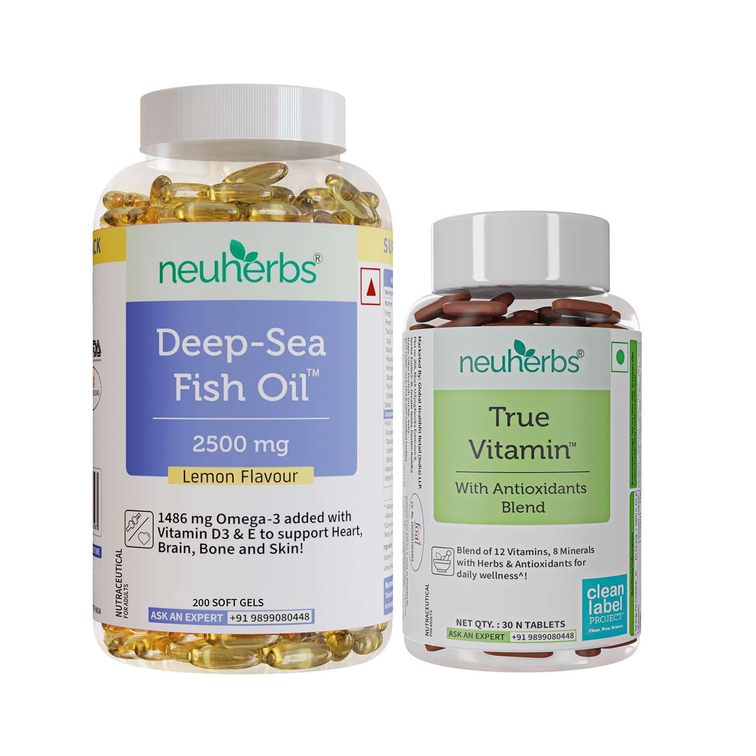 Neuherbs is here with a strength booster combo in a super saver pack with a duo of Neuherbs Fish Oil and Neuherbs True Vitamin for your journey towards a healthy lifestyle. This combo is perfect for a supercharged and super busy lifestyle. On one hand where Neuherbs Extraordinary Deep Sea fish oil with Vitamin D3 and E provides the Omega care for healthy heart brain bone skin health. On the other hand Neuherbs True Vitamin is a complete multivitamin for men and women formulated with essential vitamins minerals herbs & natural antioxidants to charge you with energy immunity strength & stamina. This duo can be incorporated in daily life to enhance the workout & boost muscle building. This Deep Sea Fish Oil comes in a super saver pack with 200 softgels with the astonishing benefits of free True Vitamin multivitamin tablets. Try this duo to improve your well-being.