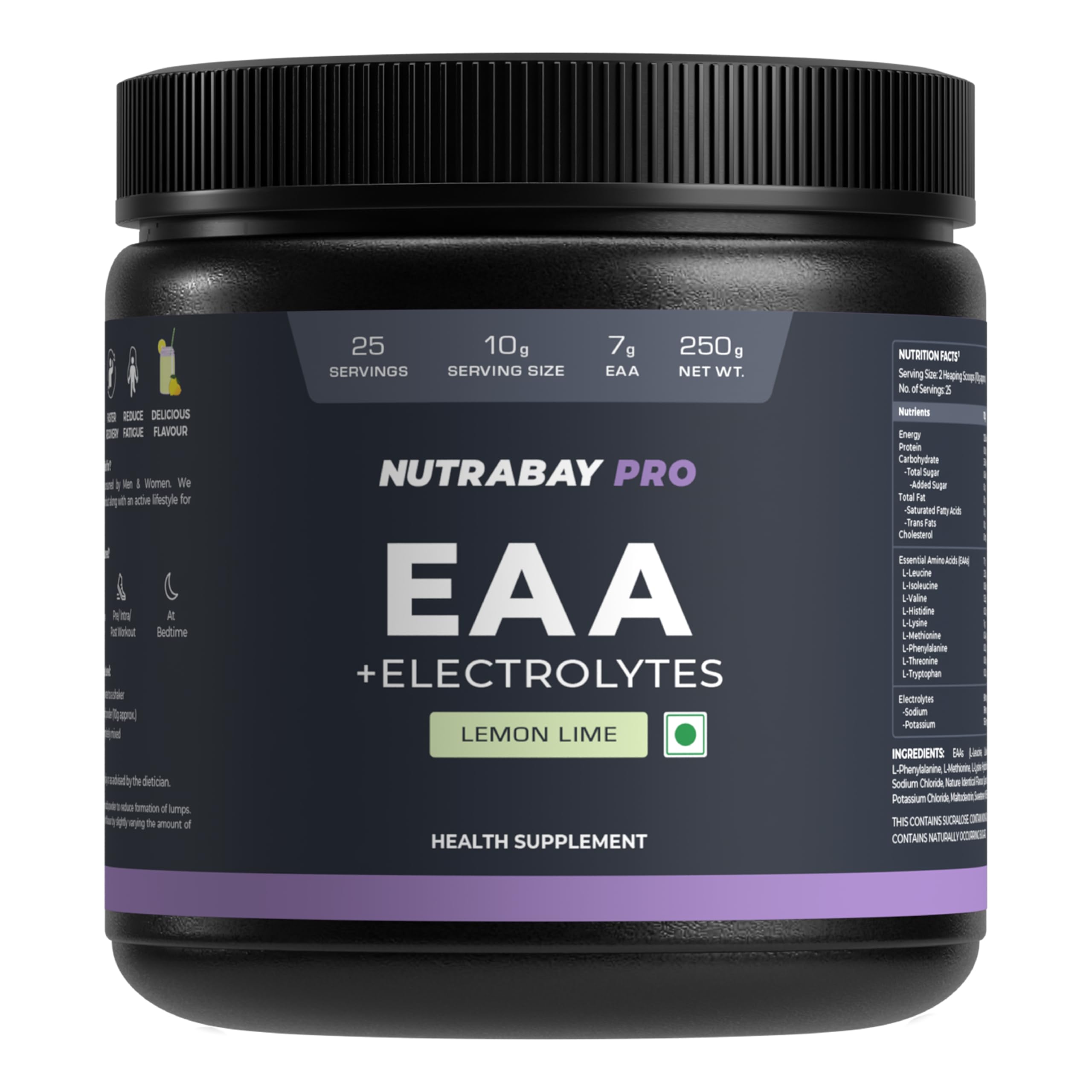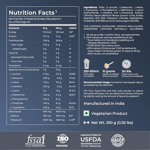 Nutrabay Pro EAA with Electrolytes is an intra-workout drink which contains a perfect blend of all 9 essential amino acids along with electrolytes. It has been specifically crafted to enhance muscle recovery reduce soreness balance cortisol levels and support better muscle contraction. Presence of extra-strength electrolytes and 9 essential aminos provide perfect hydration and fight oxidative stress during and after an intense workout.