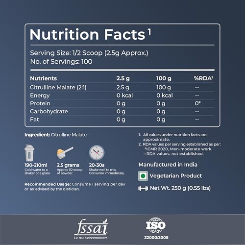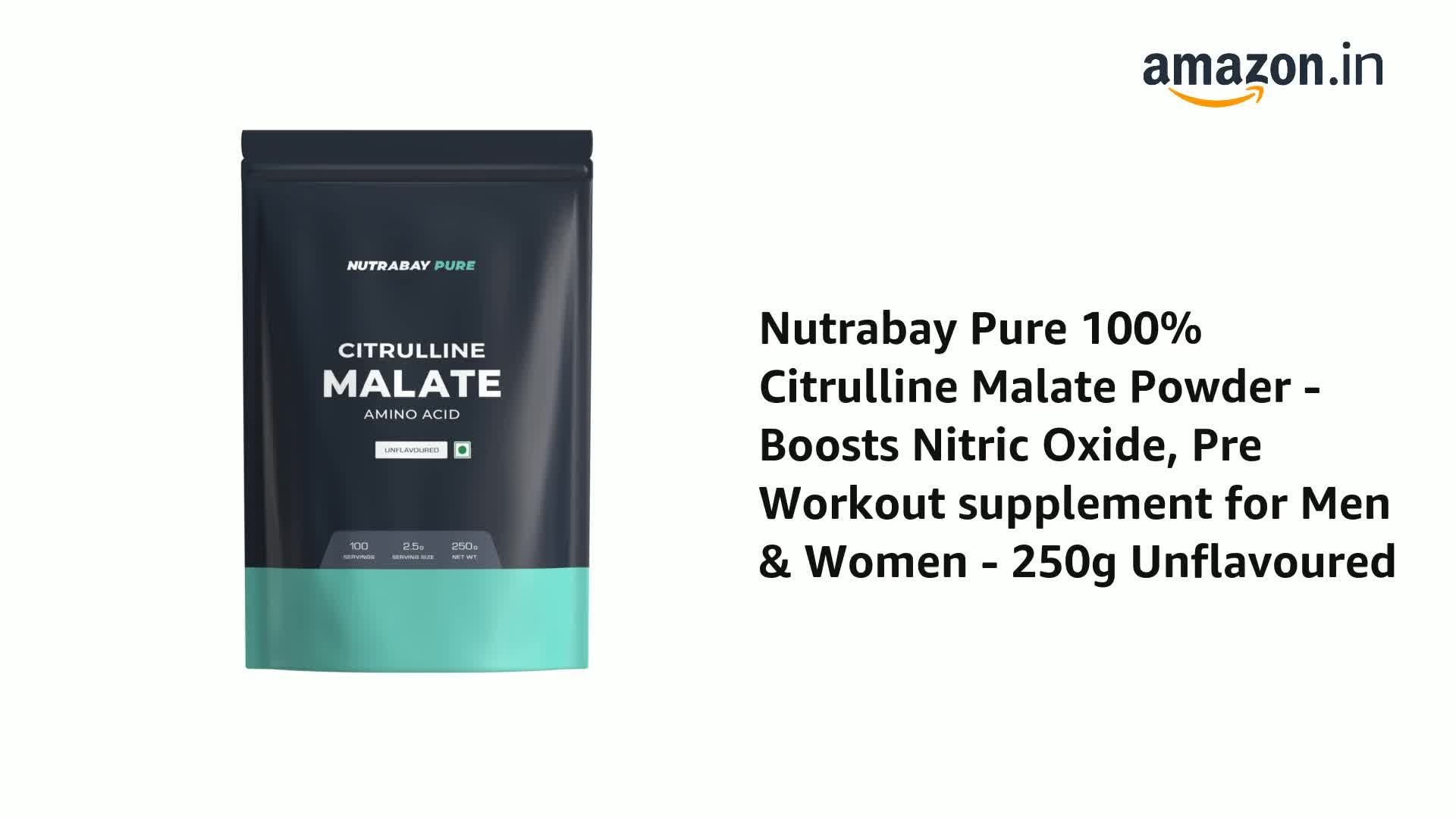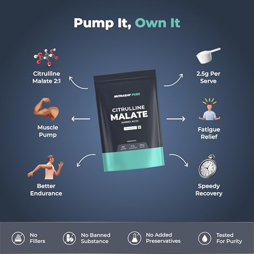 Nutrabay Pure 100% Citrulline Malate helps facilitate increased flow of blood and nutrients to muscles leading to bigger muscle growth. Consumption of Citrulline Malate helps enhance the endurance during your workouts by removing ammonia from the body before it can cause muscle fatigue and keeping you energized for the longer duration. Banned Substance Free : Athletes can be assured it has undergone rigorous checks and testing to ensure that it is not contaminated with any banned substances and is safe to use. Nutrabay Pure 100% Citrulline Malate is extracted from a vegan source. No Added sugar eliminates unnecessary calories. No added preservatives No Artifical Colour & No Fillers ensure you get the best out of your workout supplement. Nutrabay Pure 100% Citrulline Malate is unflavoured in nature which gives you the freedom to add with any other pre-workout drink to get a quick energy refill.
