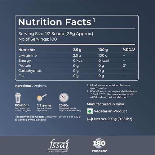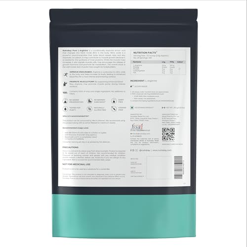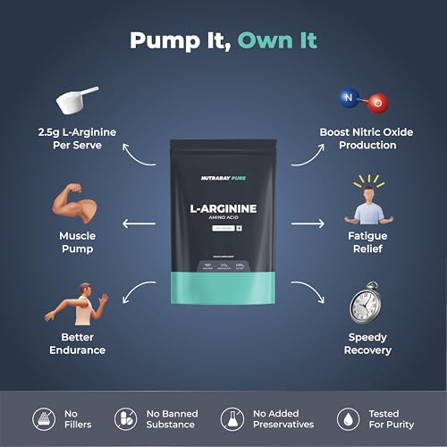 L-Arginine is Nutrabay Pure 100% L-Arginine is an essential amino acid that helps promote healthy circulation. This means more oxygen reaches your Muscles Brain Heart Lungs and other organs. More blood flow means more muscle gains. L-Arginine also supports energy levels which makes it perfect for weightlifters runners and everyday active people. It also helps maintain good blood sugar levels and provides support for a healthy immune system. Banned Substance Free : Athletes can be assured it has undergone rigorous checks and testing to ensure that it is not contaminated with any banned substances and is safe to use. Nutrabay Pure 100% L-Arginine is extracted from a vegan source. No Added sugar eliminates unnecessary calories. No added preservatives No Artifical Colour & No Fillers ensure you get the best out of your workout supplement. Nutrabay Pure 100% L-Arginine is unflavoured in nature which gives you the freedom to add with any other pre-workout drink to get a quick energy refill. an amino acid that changes into Nitric Oxide (NO) in the body. Nitric oxide is a powerful neurotransmitter that helps blood vessels relax and also improves circulation. It contributes to muscle growth because it is needed for the synthesis of most proteins. While the muscle mass increases it also signals muscle cells encourages the release of growth hormone and promotes fat metabolism. The overall result is the well-toned lean muscle mass sought by bodybuilders.