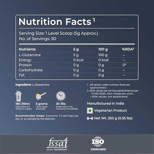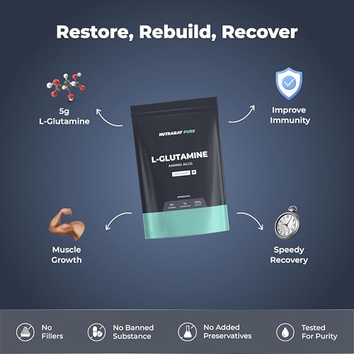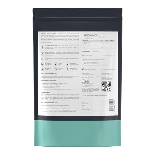 Nutrabay Pure L-Glutamine provides 5g of micronized glutamine that helps in soothing the muscles to boost the recovery process and restricts muscle breakdown post-workout. Muscle Recovery : Glutamine drives Protein into the muscle cell where it is synthesized for Growth helping in Muscle recovery. Increased levels of l-glutamine can help build immunity by leading to a greater amount of infection fighting cells. Improves Muscle Volume & Stamina - Glutamine drink helps to enhance the blood flow to the muscles. Thus resulting in enhanced Muscle volume and Higher Stamina. Nutrabay L-Glutamine is 100% Pure Glutamine Vegan Friendly with No Artificial Colour No fillers No Added Sugar and No Banned Substances. Gluten Free Dairy Free Steroid Free Tested for purity. Our high-quality and pure L-Glutamine powder is cost-effective. Mix 5g (about 1 Scoop) of Glutamine with 190 ml to 210 ml of water juice or protein. Unflavored can be mixed with your any favorite beverage with ease.