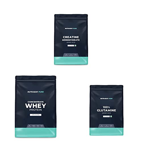 Nutrabay Pure Micronised Creatine Monohydrate, 250g, Unflavoured, 83 Servings & Pure 100% Whey Protein Concentrate, Raw Whey,Unflavoured, 500 g & Pure L-Glutamine Powder, Amino Acid, 250g, Unflavoured