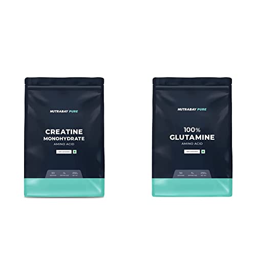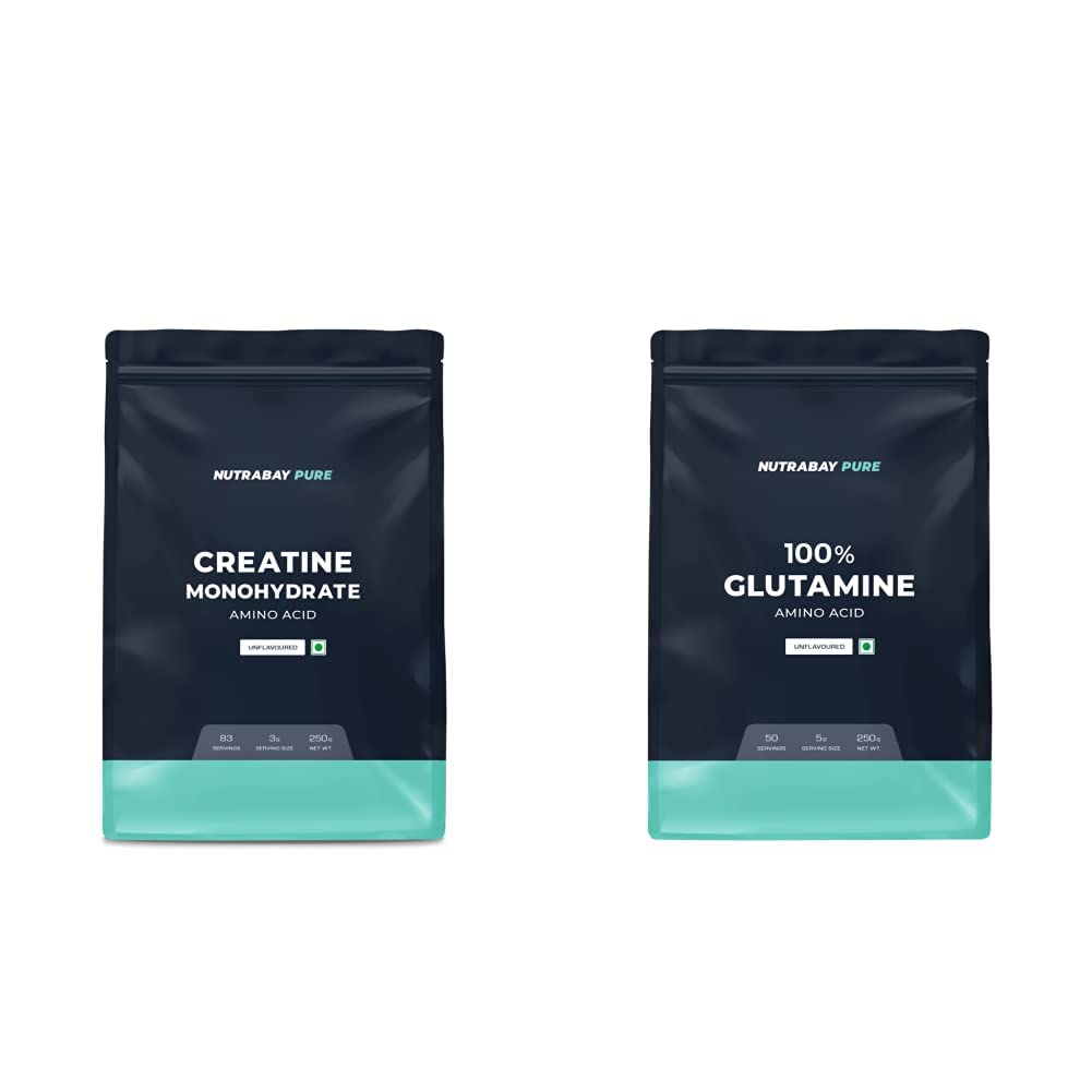 Nutrabay Pure Micronised Creatine Monohydrate & Pure L-Glutamine Powder, Amino Acid - Post Workout Supplement for Muscle Growth & Recovery - 250g, Unflavoured