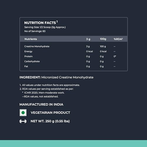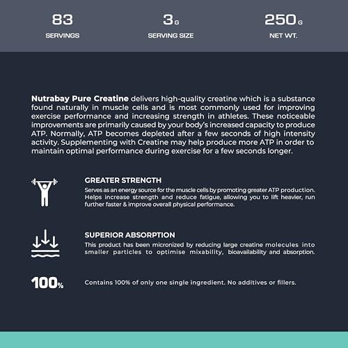 • Nutrabay Pure Creatine Monohydrate contains 3g of fast absorbing micronized creatine in each serving for raabsorption rate with faster results in building strength and endurance
