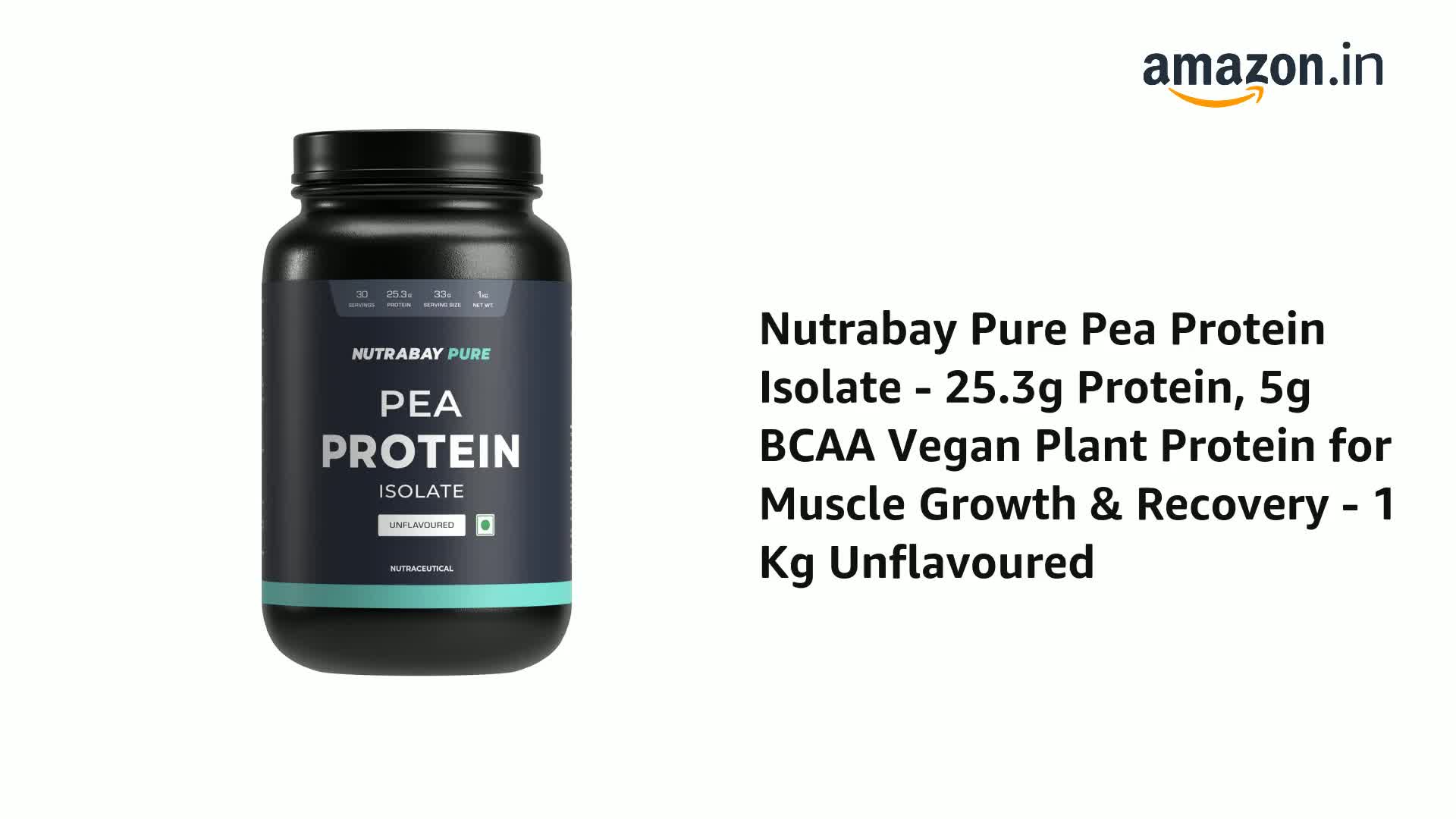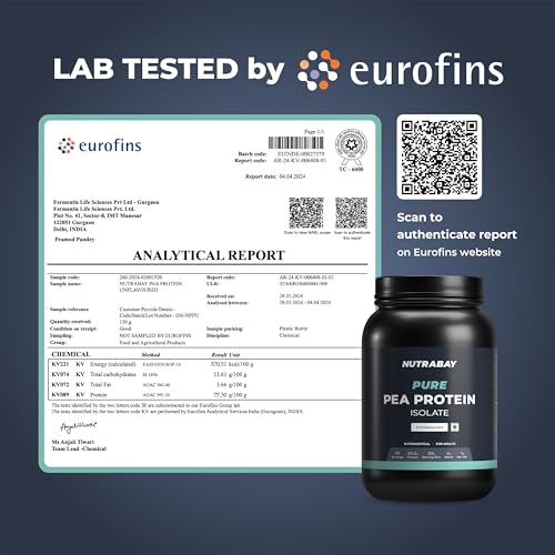 Nutrabay Pure Pea Protein is 100% Vegetarian Plant based Protein from vegetable (Peas) with complete amino acid profile for Vegans. One of the best non-dairy Gluten Free Soy Free Lactose free source of protein. Nutrabay Pure Pea Protein Isolate is Plant based Protein with a complete amino acid profile which delivers 25.3g Protein & 5g BCAA per serve. Best option for Gym Goers Athletes and Sports Enthusiasts who do intense training. Nutrabay Pea Protein is unflavoured in nature which gives you the freedom to add the flavor of your choice. Lactose Free No Amino Spiking No Artificial Colour No fillers No Added Sugar Gluten Free and No Banned Substances. This vegan plant protein is ideal as a post-workout supplement as it helps with Muscle growth Build Lean muscle Enhances recovery Supports Healthy Metabolism Boosts Immunity and Reduces Muscle loss. Keto Diet Friendly - If you are on a Low Carb Diet or Keto Diet Nutrabay Pure Pea Vegan Plant Protein is for you. It has very low carbs which makes it ideal for all low carb diets and can be used with any recipe to make a High Protein Shake.