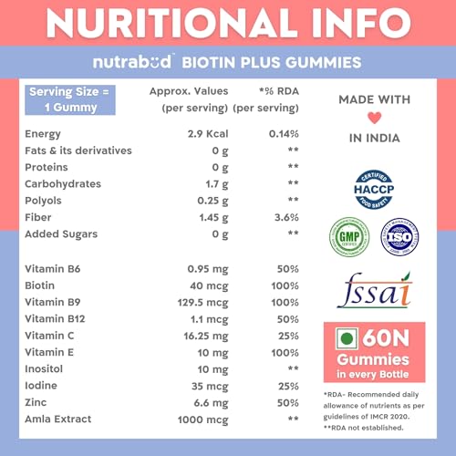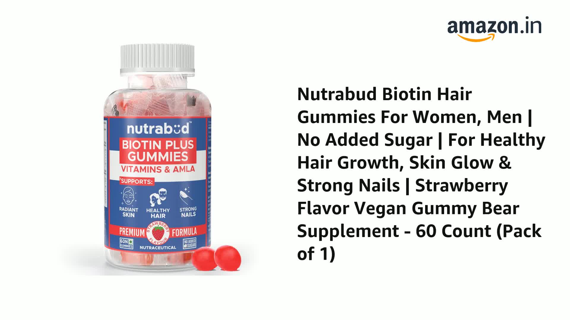 Biotin Gummies deliver the highest potency and most effective dose of biotin that youâll find. Enjoy all the amazing benefits of biotin in the form of a convenient great tasting gummy â with Nutrabud now there is no need to consume tablets capsules powders. Designed for practical and easy on-the-go supplementation for men women. These convenient and delicious gummies are fantastic â just like your hair skin and nails will look after just a couple of months of use. Start enjoying today and you can thank us later! Longer stronger and healthier hair are at the forefront of the famous benefits of biotin but its incredible impacts on skin and nails will also be a highlight that youâll definitely notice! Caring for your hair skin and nails is not just about what kind of products you use on the outside but also about what nutrients you put into the inside of your body. Nutrabud Biotin helps you address an internal vitamin deficiency so that you can have stronger nails tighter glowing skin and thicker fuller and healthier hair! These gummies were designed to offer the best and leave out the rest. Our gummies are perfect for anyone looking for a clean and green way to get biotin into their diet. With no gelatin animal products gluten soy eggs dairy or nuts you can feel confident in the quality and purity of what youâre putting in your body. Perfect biotin gummies for hair and nail growth supplement for on-the-go! Now biotin is easy to add to your daily routine! Hair skin and nail vitamins for women and men!