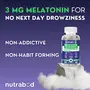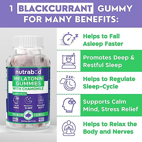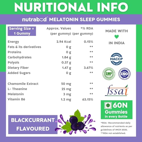 Introducing Nutrabud Melatonin gummy a non-prescription sleep supplement that features an optimal dose of 3mg Melatonin per gummy. This tasty and potent gummy supplement aids in falling asleep faster stay asleep longer and helps in waking up recovered refreshed in the morning without any drowsiness. Melatonin supplement for men and women manages issues of Jet lag and Insomnia by setting the natural biological clock. Melatonin is the body's natural sleep signal to guide our sleep-wake cycle is produced naturally at night. It is completely non-addictive non-habit forming and does not cause drowsiness laziness the following day. Melatonin is the best alternative for sleeping pillstablets or any other melatonin supplements for men and women. .The gummy also includes Vitamin B6 blended with natural Chamomile & L-theanine which combats tiredness and fatigue allowing you to wake up rejuvenated. Enjoy the delicious blackcurrant flavor (No Added Sugar No Artificial Sweetener) in a fun chewable gummy format. Simply consume one to two gummies 30 minutes before bedtime. For optimal results exercise daily and consume for 2-3 months. This sleep aid product is not intended to diagnose treat cure or prevent any disease.