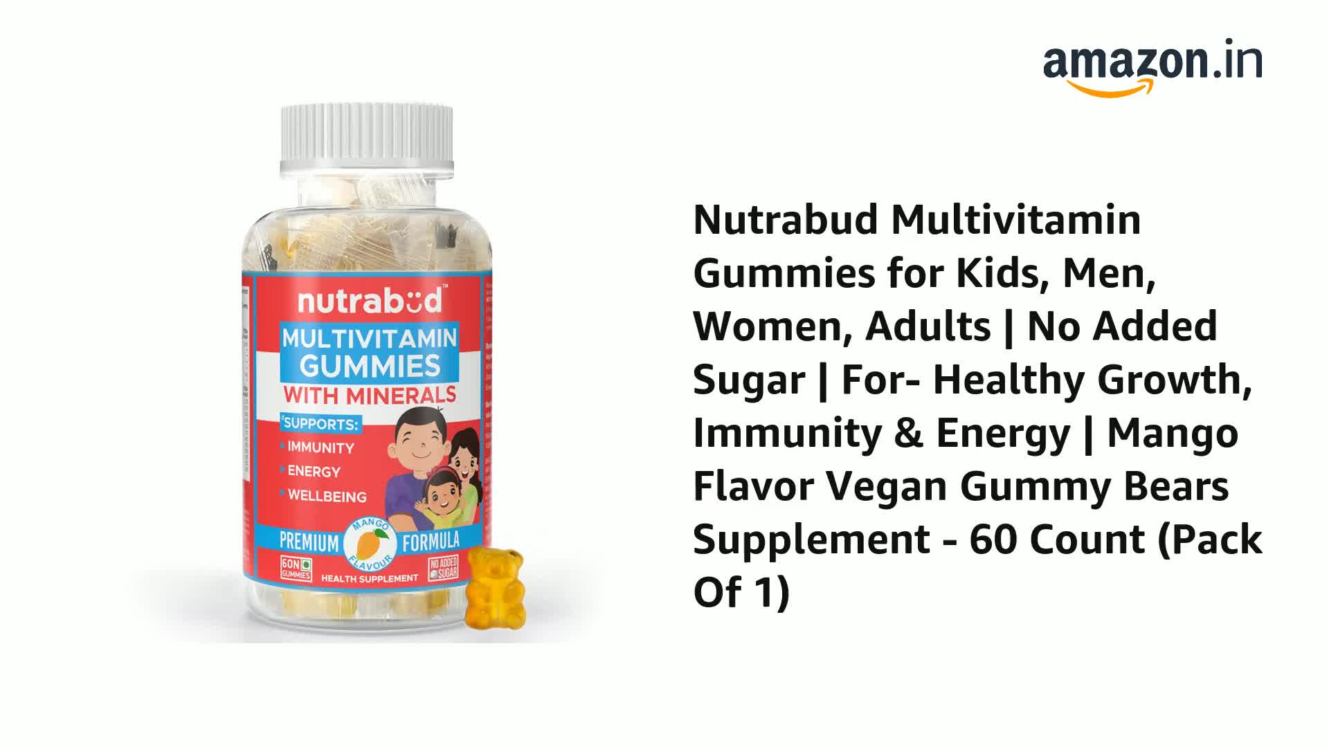 Introducing- Nutrabud Multivitamin Gummies for Kids Teens & Adults. Each serving of multivitamin gummies for children includes the goodness of- Vitamin D Vitamin B12 to support energy metabolism Vitamin C & Zinc for immunity Biotin & Vitamin E for healthy hair and skin Vitamin A for sharp eyes Folic acid Iron Magnesium for healthy growth. Nutrabud multivitamin and mineral gummies for kids are multifunctional they contain all the nutrients parents want in a delicious format that kids love. Good health is at the center of everything we do. That's why weâve made it our mission to make nutrition easy to understand. Nutrition Backed Science Developed by leading scientists our vitamin gummies are vegetarian and sugar-free enriched with vitamins minerals & Prebiotic fiber and designed to improve the quality of life of the entire family- Kids parents alike. A to Z Ingredients Designed to leave your mind and body feeling invigorated and uplifted our experts offer you products containing the active ingredient covering A-Z of health scientifically proven to aid overall wellness from vitamin A C E through to Zinc. Suitable For Everyone Nutrabud gummies are proudly vegetarian-friendly non-GMO cruelty-free and gluten-free and contain natural flavors making them suitable for everyone to consume. Yummy Gummy with 12 essential Multi-vitamin & minerals in Delicious mango flavor for children above 3 years Made with selected premium ingredients to boost immunity and overall development of your child's growth