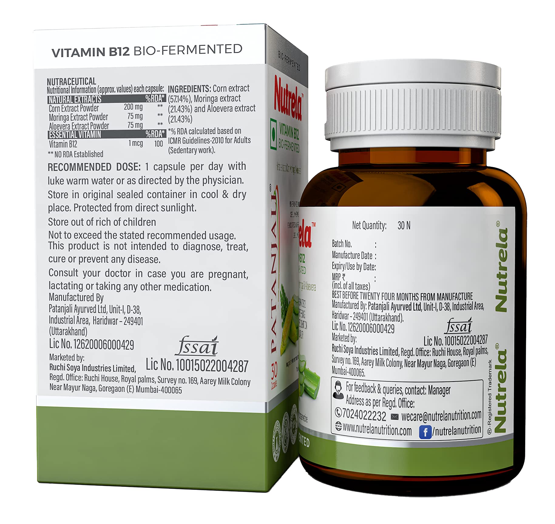 NUTRELA Patanjali Vitamin B12 Biofermented Plant Based Supplement for Men & Women with Moringa and Alovera Extract - 30 Veg Capsules