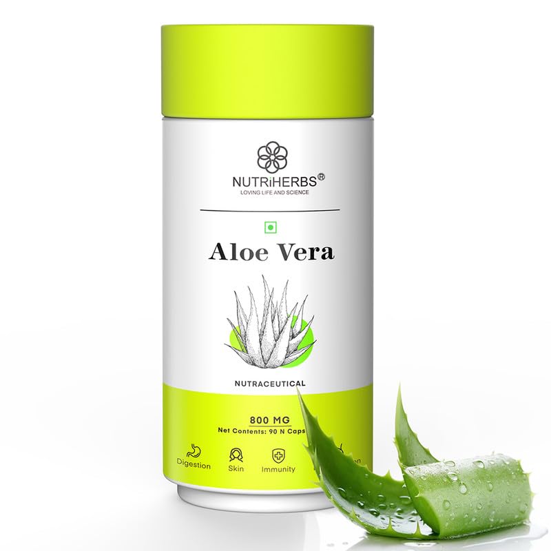NUTRiHERBS Aloe Vera Capsules 800mg | Pure Aloe Vera Extract for Skin, Hair, Immunity & Digestion | Herbal Skin Care & Digestive Health Supplement (90 Capsules)