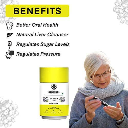 • Nutriherbs Jamun Extract Capsules are enriched with multi-nutrient benefits. Jamun capsules has the correct combination of essential nutrients with fewer calories. The presence of flavonoids essential oils and organic acids like malic acid and oxalic acid
