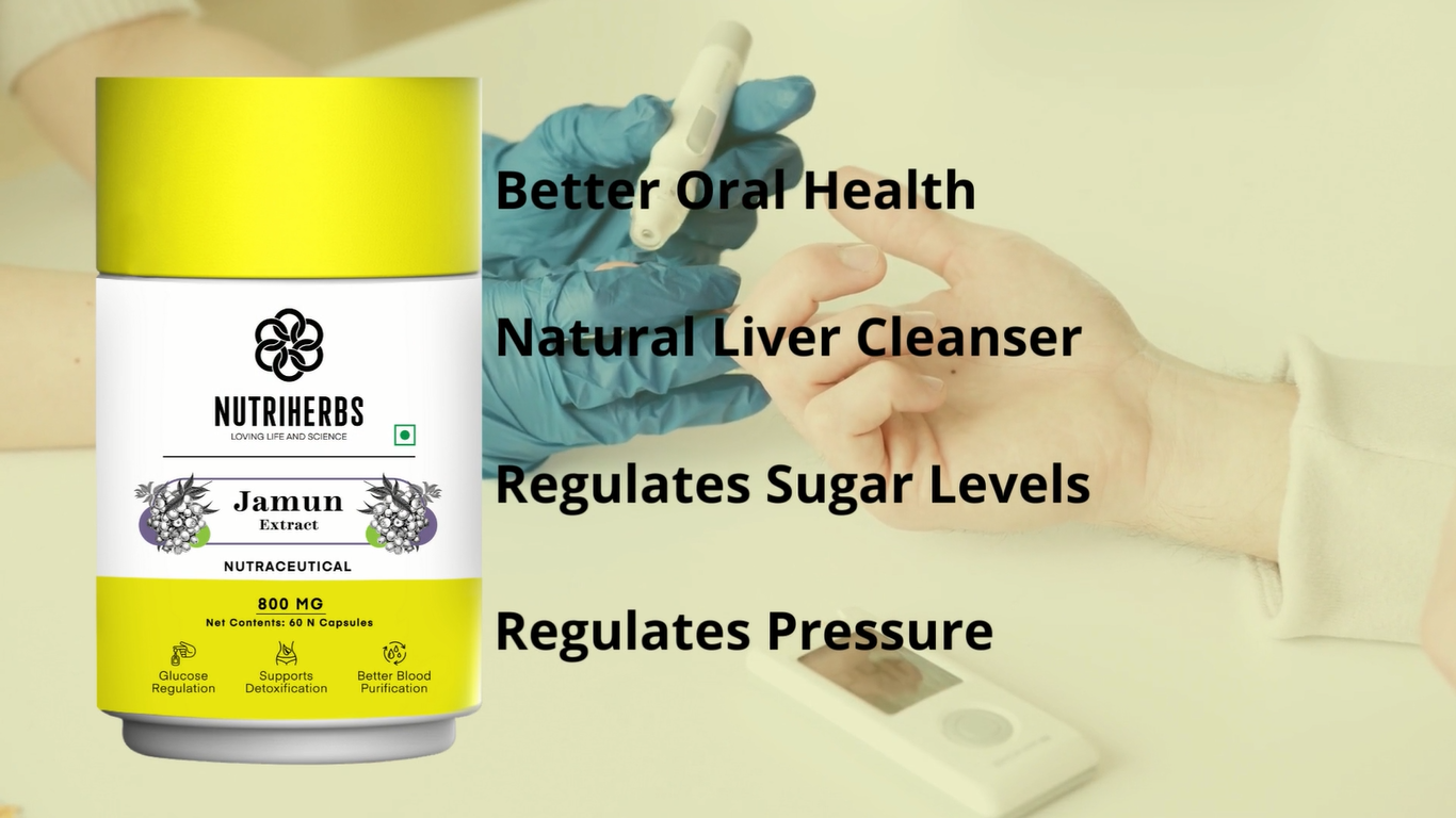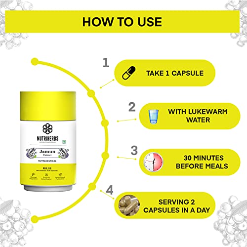 • Nutriherbs Jamun Extract capsules are made in India & free from chemicals and fillers. These capsules should be consumed twice daily for best results. These antioxidant capsules are organic highly effective & may contribute towards a better lifestyle.