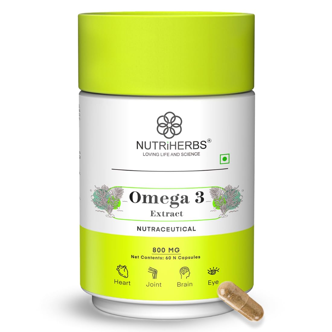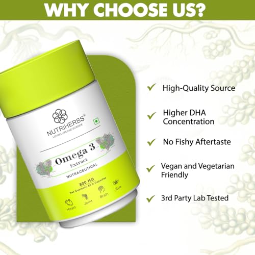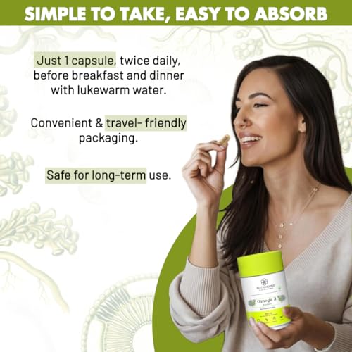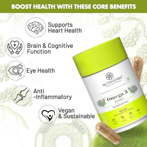 NUTRiHERBS Omega 3 800mg Capsules | Plant-Based DHA & EPA Supplement for Heart, Joint, Eye Health | Omega 3 Fatty Acids for Brain Support, Skin Wellness | for Men & Women (60 Capsules)