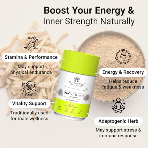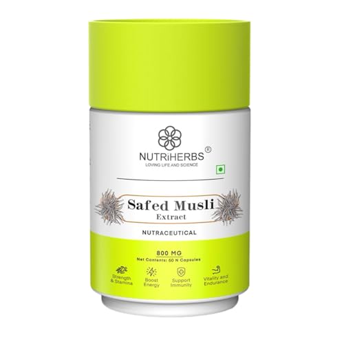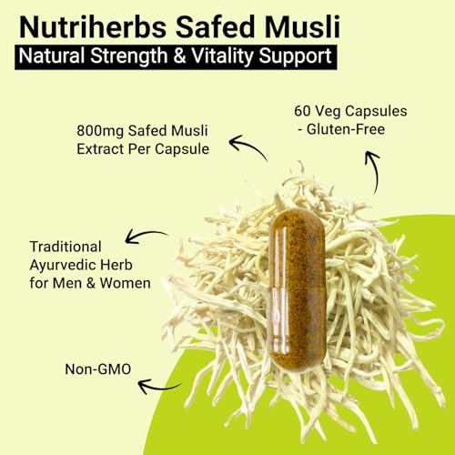 NUTRiHERBS Safed Musli Extract Capsules 800mg – Supplement for Men's Muscle Strength, Stamina, Energy, and Immunity – Organic Safed Musli Root (60 Capsules Pack of 1)