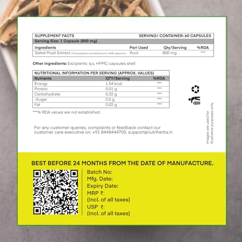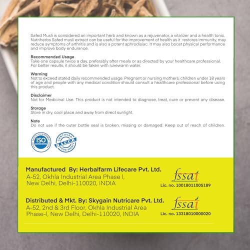 • How to use: It is recommended to take one nutriherbs safed musli capsule two times a day 30 minutes after breakfast and dinner with lukewarm water or milk or as directed by your healthcare professional.