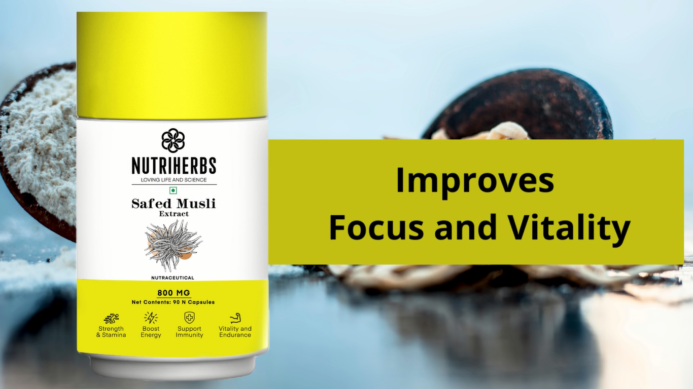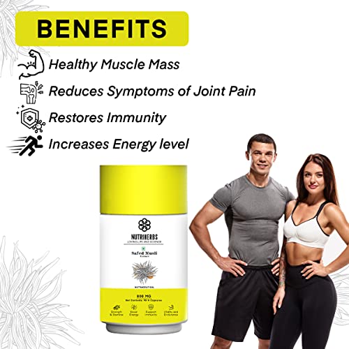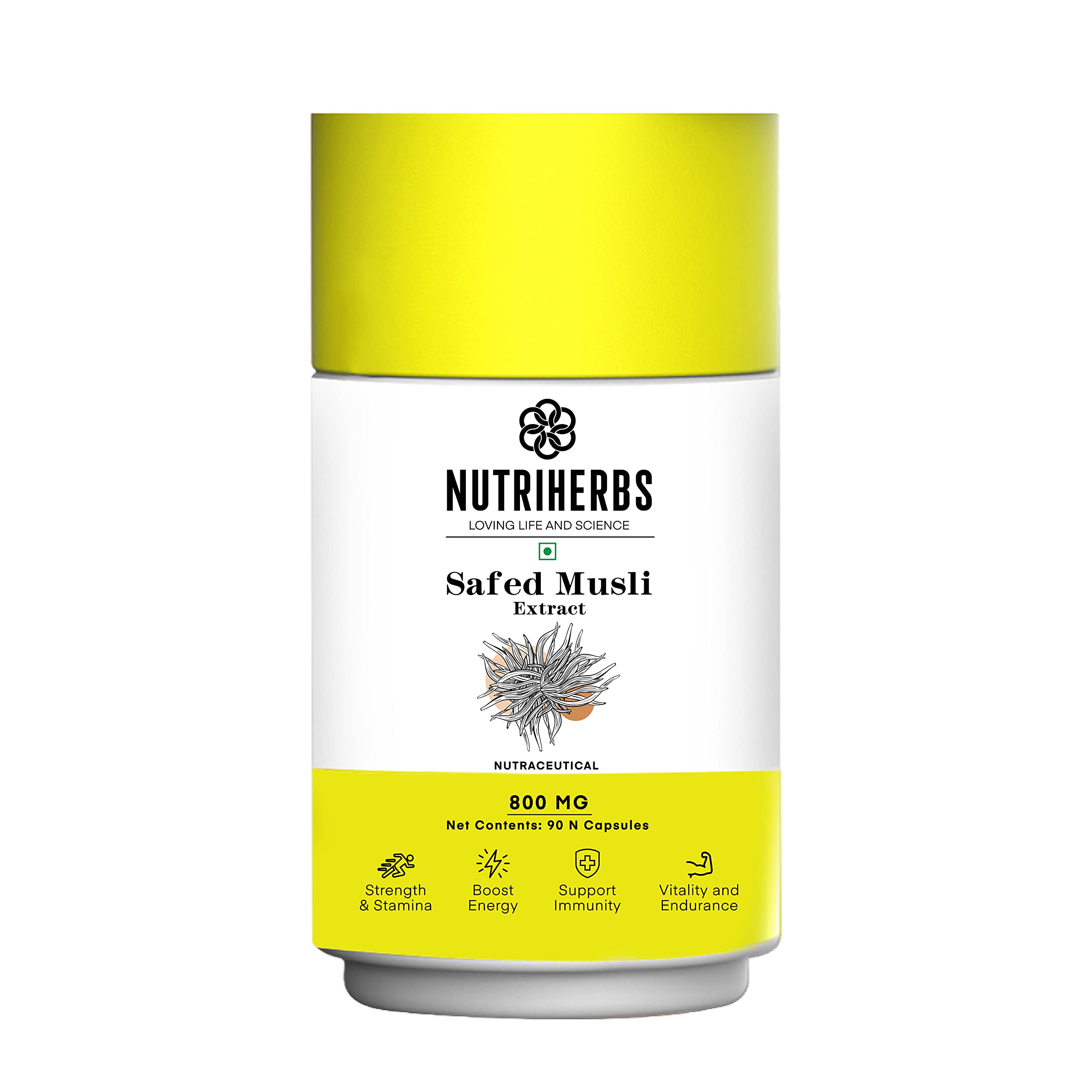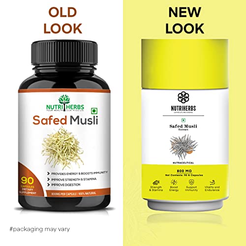 NUTRiHERBS Safed Musli Extract Capsules 800mg – Herbal Supplement for Men's Muscle Strength, Stamina, Energy, and Immunity – Organic Safed Musli Root – 90 Vegetarian Capsules