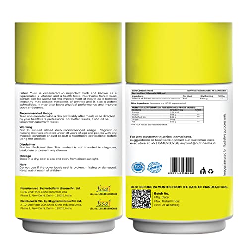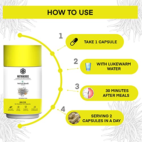 • Nutriherbs Safed Musli capsules are made in India & free from chemicals and fillers. These capsules should be consumed twice daily for best results. These energizer capsules are organic highly effective & may contribute towards a better lifestyle.