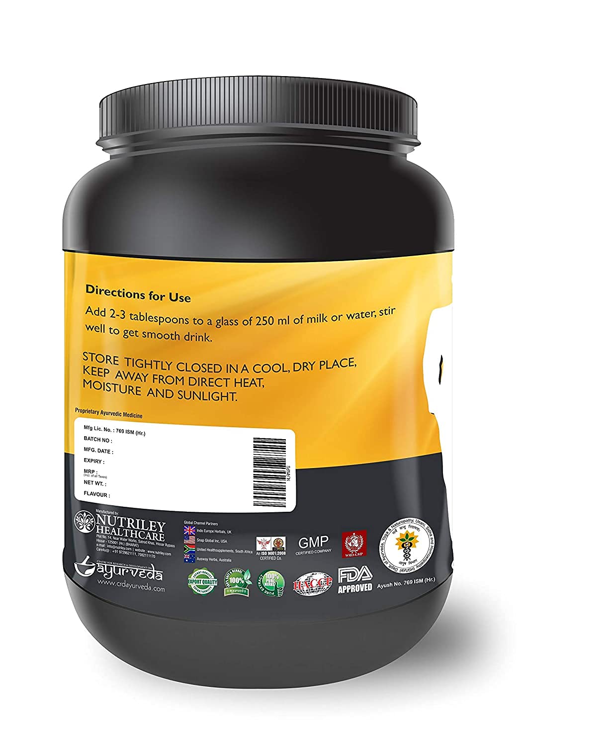 Ingredients (each 10 gms): Whey protein 5 gm skimmed milk powder 2 gm crushed sugar 1.5 gm millet flour 1.5 with: soya beej(anrthum sowa) 800 mg shatavari(asparagus racemosus) 1200 mg vidhari kandi(pueria tuberosa) 500 mg safed moosali(asparagus adsecendens) 500 mg salam mishri(orchid mascula) 500 mg bala(sida cordifolia) 500 mg ateebala(abutilon indicum) 500 mg ashwagandha(withania somniferra) 500 mg munnaka(vitis venifera) 300 mg.
