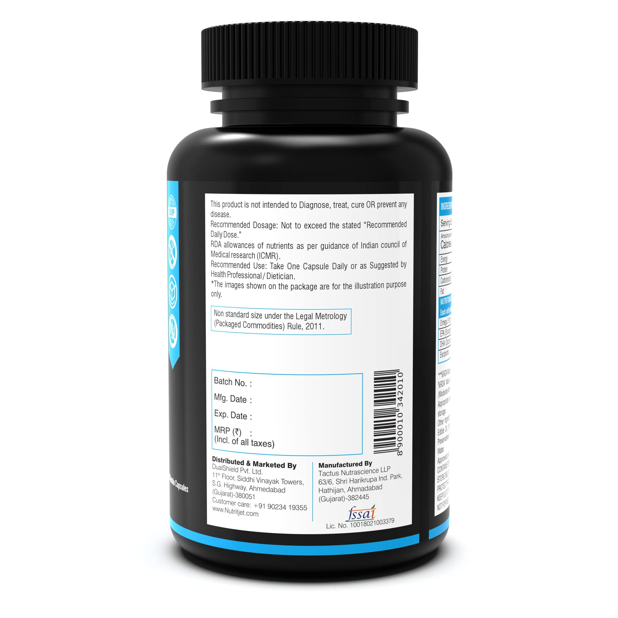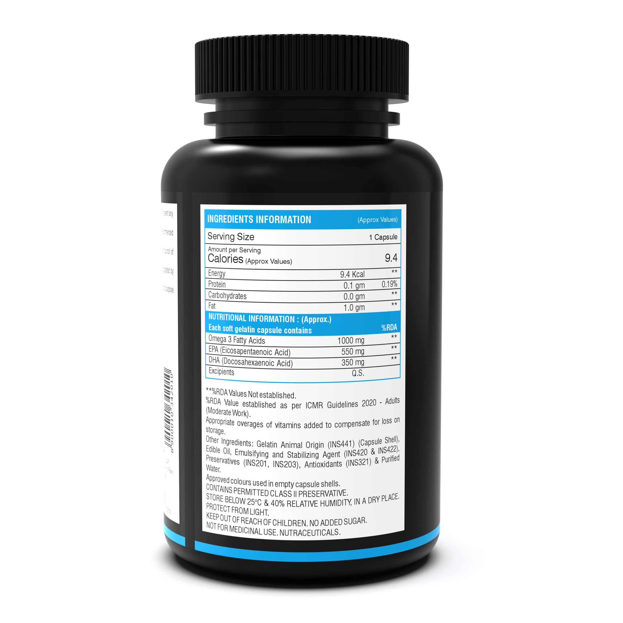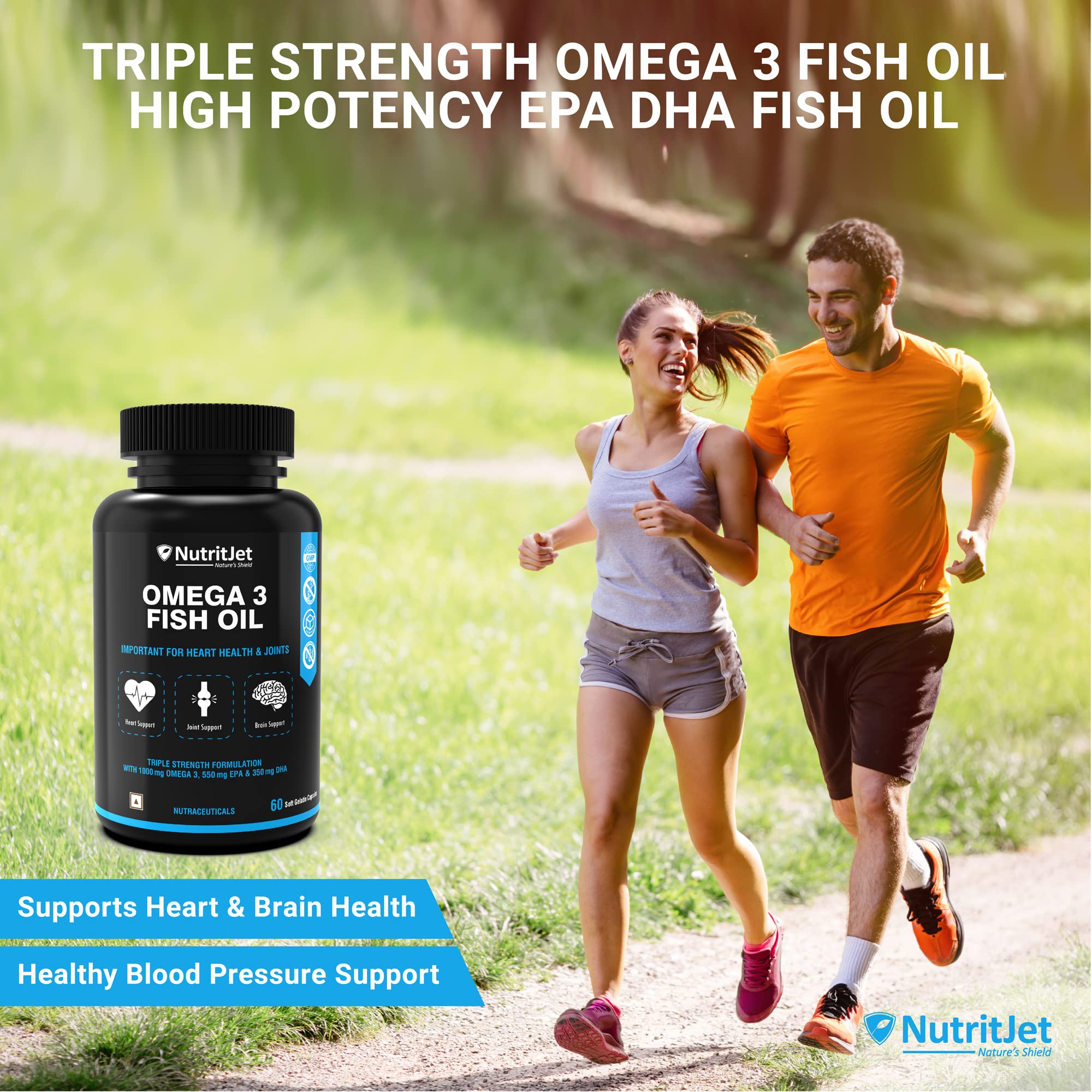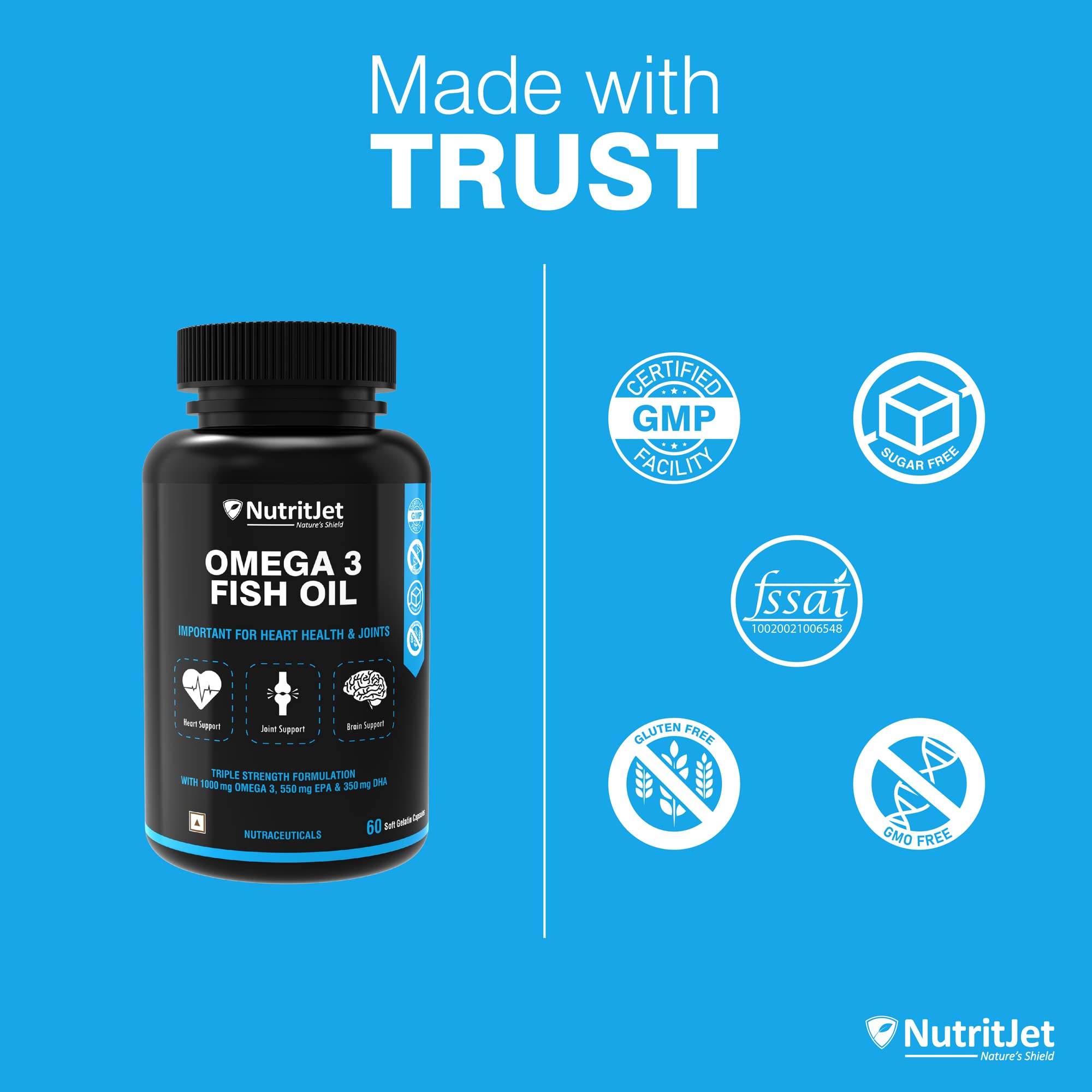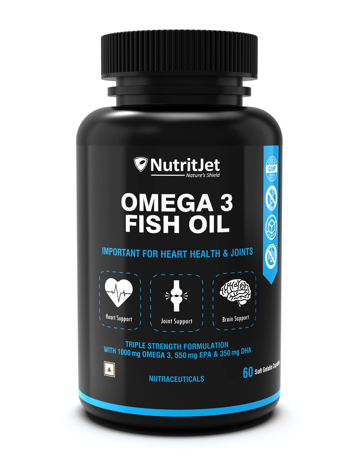 NutritJet's Omega 3 Fish Oil contains high amounts of both DHA & EPA. Our Omega3 Fatty Acid Capsule provides 1000mg fish oil with 550mg EPA 350mg DHA per capsule. Omega 3 fatty acids are essential nutrients that are important for supporting a healthy heart brain joints bones hair Skin and a positive mood. NutritJet's Fish oil is purified with molecular distillation at low temperatures that can purify from heavy metals and other toxins to below detectable limits for human consumption.