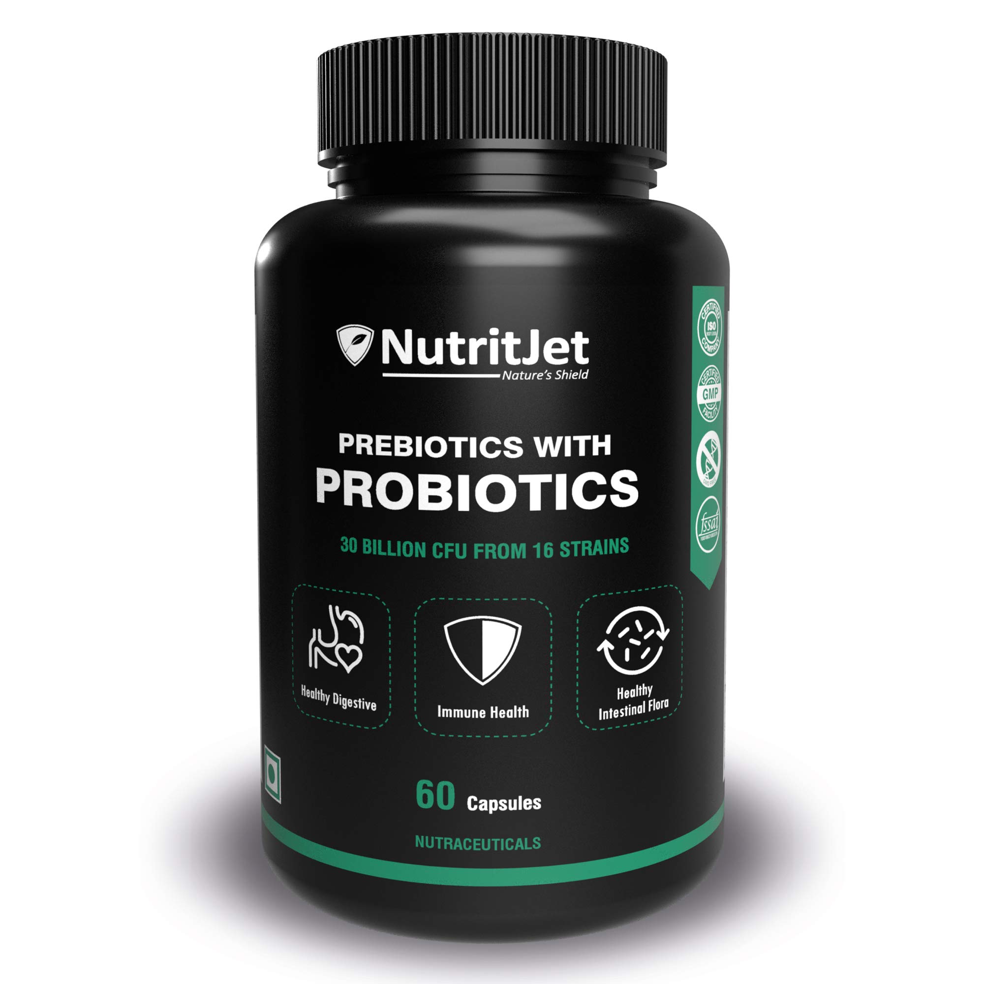 NutritJet Probiotics Supplement 30 Billion CFU For Women & Men with 16 Strains - Probiotic Supplement with Prebiotic Good For Digestive Gut health Immunity - 60 Vegetarian Capsules