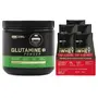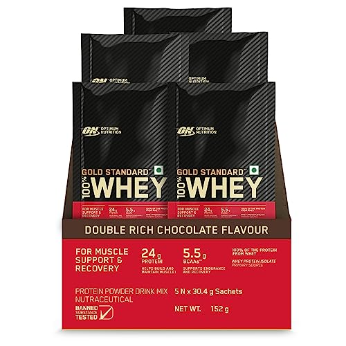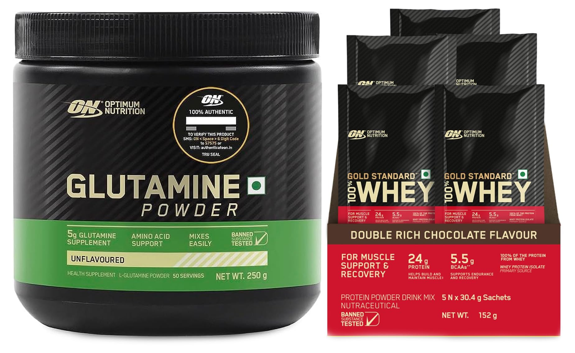Optimum Nutrition L-Glutamine Powder Amino Acid Support & Muscle Recovery 5g Glutamine per serve 250 GramPack of 50 ServesGlutamine is the most abundant amino acid in the body and plays an important role in the muscle protein synthesis & development. During prolong period of intense exercise glutamine levels can be depleted which can limit protein synthesis. With 5 gram L-Glutamine per serving our glutamine powder is a simple way to support your diet with amino acid. Simply one serving of Glutamine Powder provides more glutamine than 4 large eggs 4 oz. of lean mutton ¾ cup of soybeans or a 4 oz. chicken breast.Optimum Nutrition (ON) Gold Standard 100% Whey Protein - 5 X 30.4 g (Double Rich Chocolate) Single Serve Sachets for Muscle Support & Recovery Vegetarian - Primary Source Whey IsolateWorldâs #1 selling whey protein powder Optimum Nutrition Gold Standard 100% Whey now available in affordable travel friendly and very handy single serve sachets. This pack contains five single serve sachets and each sachet provides one serving that will provide 24 grams of protein 11 grams of naturally occurring essential amino acids including 5.5 grams BCAAs and over 4 grams of glutamine. To instantly check the authenticity of your ON product SMS us your 6 digit unique code (on the pack) at 57575 or visit our website AUTHENTICATEON.in