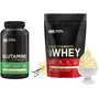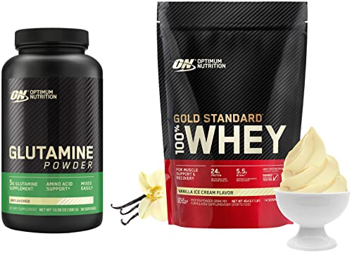 Optimum Nutrition (ON) Gold Standard 100% Whey Protein Powder 1 lbs 454 g (Vanilla Ice Cream) for Muscle Support & Recovery Vegetarian - Primary Source Whey IsolateOptimum Nutrition's Gold Standard 100% Whey uses pure Whey Protein Isolates as the primary ingredient. Combined with ultra-filtered whey protein concentrate each serving provides 24 grams of all-whey protein and 5.5 grams of naturally occurring Branched Chain Amino Acids (BCAAs) which are prized by athletes for their muscle building qualities. With 10 tempting flavors to choose from ON Gold Standard 100% Whey gives you plenty of ways to keep workout recovery interesting. To instantly check the authenticity of your ON product SMS us your 6 digit unique code (on the pack) at 57575 or visit our wesite AUTHENTICATEON.inOptimum Nutrition L-Glutamine Powder Amino Acid Support & Muscle Recovery 5g Glutamine per serve 250 Gram 50 ServesGlutamine is the most abundant amino acid in the body and plays an important role in the muscle protein synthesis & development. During prolong period of intense exercise glutamine levels can be depleted which can limit protein synthesis. With 5 gram L-Glutamine per serving our glutamine powder is a simple way to support your diet with amino acid. Simply one serving of Glutamine Powder provides more glutamine than 4 large eggs 4 oz. of lean mutton ¾ cup of soybeans or a 4 oz. chicken breast.