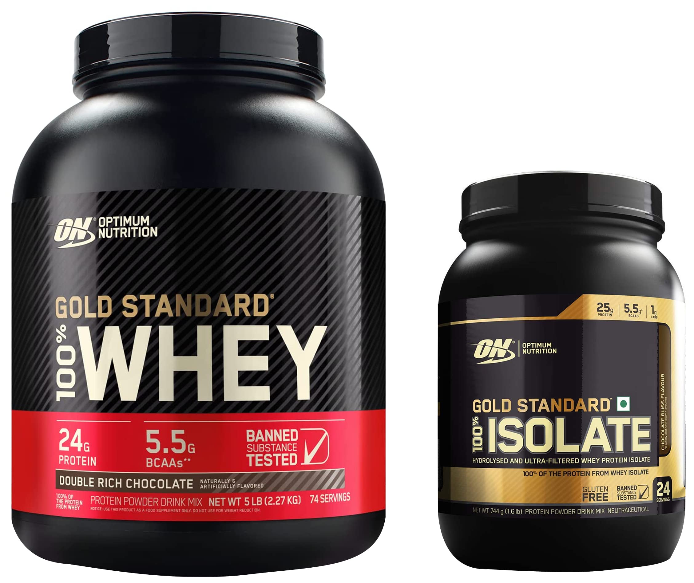 Optimum Nutrition (ON) Gold Standard 100% Whey Protein Powder - 5 lbs 2.27 kg (Double Rich Chocolate) Primary Source IsolateFor Men and WomenOptimum Nutrition's Gold Standard 100% Whey uses pure Whey Protein Isolates as the primary ingredient. Combined with ultra-filtered whey protein concentrate each serving provides 24 grams of all-whey protein and 5.5 grams of naturally occurring Branched Chain Amino Acids (BCAAs) which are prized by athletes for their muscle building qualities. With 10 tempting flavors to choose from ON Gold Standard 100% Whey gives you plenty of ways to keep workout recovery interesting. To instantly check the authenticity of your ON product SMS us your 6 digit unique code (on the pack) at 57575 or visit our wesite AUTHENTICATEON.inOptimum Nutrition (ON) Gold Standard 100% Isolate 1.6 lb 744 g (Chocolate Bliss) for Muscle Support & Recovery Vegetarian - 100% Protein from Whey IsolateTo create GOLD STANDARD 100% ISOLATE we start by selecting only the highest quality whey protein which undergoes a series of sophisticated filtration processes to âisolateâ out excess fat cholesterol and sugar. A portion of this Whey Protein Isolate is then hydrolyzed â broken down into smaller chains of amino acids. The final product is a fast-digesting complete protein containing no more than 1 gram of carbohydrates less than a gram of fat and more than 80% pure protein per serving to support your muscle building performance and fitness goals.
