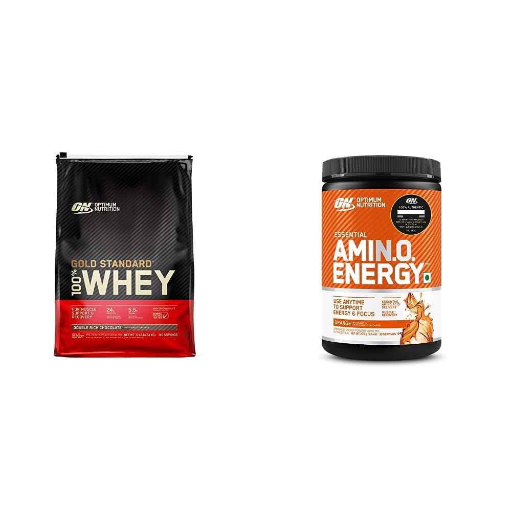 Optimum Nutrition (ON) Gold Standard 100% Whey Protein Powder - 10 lbs 4.54 kg (Double Rich Chocolate) Primary Source IsolateOptimum Nutrition's Gold Standard 100% Whey uses pure Whey Protein Isolates as the primary ingredient. Combined with ultra-filtered whey protein concentrate each serving provides 24 grams of all-whey protein and 5.5 grams of naturally occurring Branched Chain Amino Acids (BCAAs) which are prized by athletes for their muscle building qualities. With 10 tempting flavors to choose from ON Gold Standard 100% Whey gives you plenty of ways to keep workout recovery interesting. To instantly check the authenticity of your ON product SMS us your 6 digit unique code (on the pack) at 57575 or visit our wesite AUTHENTICATEON.inOptimum Nutrition (ON) Amino Energy - Pre Workout with Green Tea Extract BCAA Amino Acids Green Coffee Extract Energy Powder - Orange Cooler 30 ServingsMix up ON AMIN.O. ENERGY anytime you want a fruit flavored boost of energy and alertness. You can determine what's appropriate for any situation by adding 2 scoops of serving to 300-350ml water for an afternoon pick-me-up or increasing the amino acid matrix to 10 grams with a 4 scoop serving as a pre workout drink that delivers 200 mg of caffeine from green coffee and green tea extracts. Optimum Nutrition is proud to know that they are one of the few sports nutrition companies who own and operate their own production facilities. In fact ON's requirements for raw materials are so strenuous that it's not unusual for ON Quality Assurance Technicians to reject entire truckloads of raw materials that do not meet their high standards.