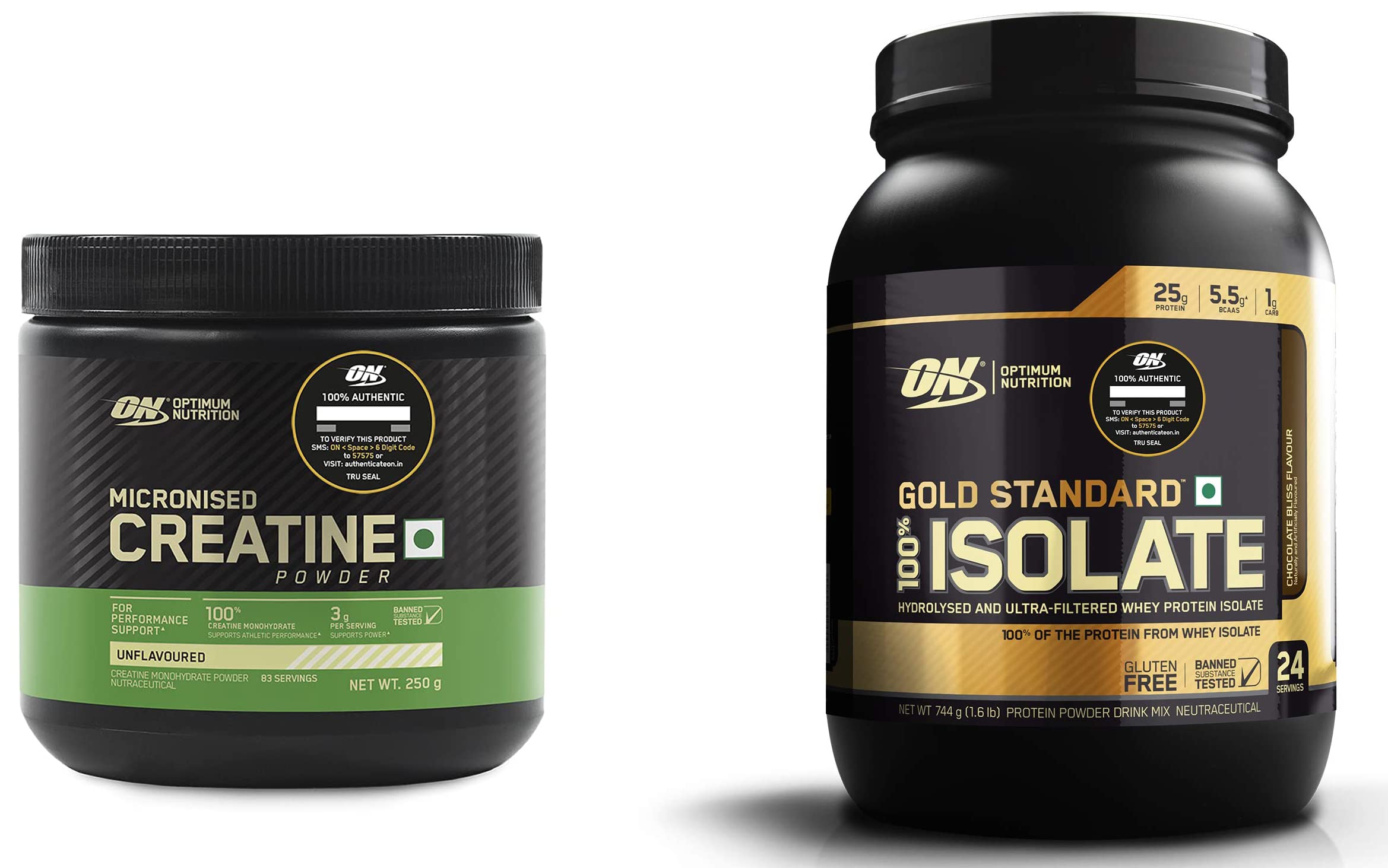 Optimum Nutrition (ON) Micronized Creatine Powder - 250 Gram 83 Serves 3g of 100% Creatine Monohydrate per serve Supports Athletic Performance & Power Unflavored.Creatine is naturally produced in our body and it is used in the recycling of ATP which is our bodyâs energy currency. Creatine monohydrate is one of the most well-researched sports nutrition ingredients. When used in combination with regular weight training it has been shown to support athletic performance and power.Optimum Nutrition (ON) Gold Standard 100% Isolate 1.6 lb 744 g (Chocolate Bliss) for Muscle Support & Recovery Vegetarian - 100% Protein from Whey IsolateTo create GOLD STANDARD 100% ISOLATE we start by selecting only the highest quality whey protein which undergoes a series of sophisticated filtration processes to âisolateâ out excess fat cholesterol and sugar. A portion of this Whey Protein Isolate is then hydrolyzed â broken down into smaller chains of amino acids. The final product is a fast-digesting complete protein containing no more than 1 gram of carbohydrates less than a gram of fat and more than 80% pure protein per serving to support your muscle building performance and fitness goals.