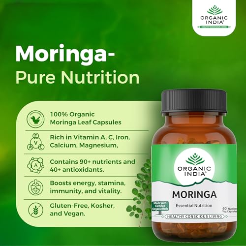 Ingredients of Organic India MORINGA vegetarian capsule: Organic Moringa leaf (Moringa oleifera) - 350 mg