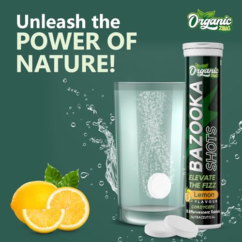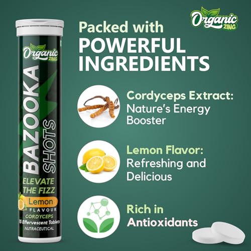 Organic Zing Bazooka Energy Effervescent Tablets - Energy Boost Pre-Workout No Crash & Boost Immunity with Cordyceps Extract - Lemon Flavor 15 Tablets