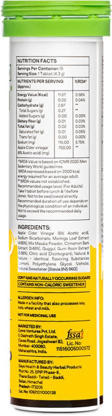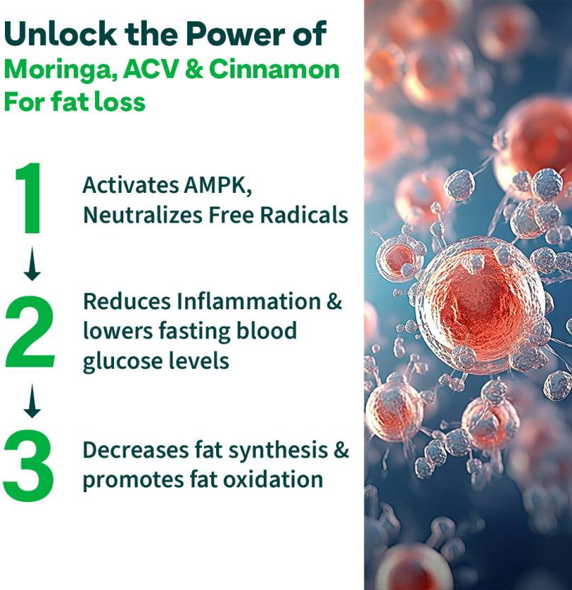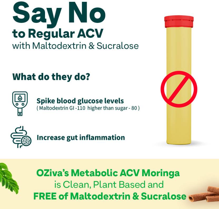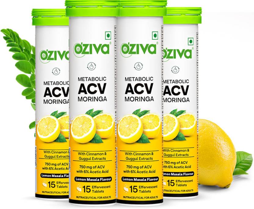 Indias Unbeatable 3-in-1 Weight Loss Formula with ACV Moringa OZiva Metabolic ACV Moringa is scientifically formulated with the multiple benefits of 3 plant-based ingredients, to supercharge metabolism, curb cravings and support your weight loss goals. ACV with Moringa leaf and Cinnamon bark extracts has been clinically studied to aid in weight reduction and maintaining optimum metabolic health. It also makes for a fizzy and flavourful health drink. 3-IN-1 FAT OXIDATION FORMULA: The combined impact of Apple Cider Vinegar (750 mg) with 6% Acetic Acid, Moringa leaf extracts and Cinnamon bark extracts, makes this 3-in-1 formulation ideal for efficient fat oxidation or the break-down of fats in the body, which later converts into energy. MORE EFFECTIVE WITH MORINGA: Clinically studied to have multiple benefits, Moringa is a unique addition to this formulation. Rich in antioxidants, Moringa reduces oxidative stress and inflammation in the body. This enables quicker recovery, improved energy levels and repair of tissues. Moringa contains vitamin B 12, A, vitamin C, E and minerals (calcium, magnesium, iron) that support and enhance energy production. SUPERCHARGES METABOLISM: Apple Cider Vinegar with Acetic Acid enhances fat metabolism and optimizes lipid levels. Acetic Acid inhibits lipogenesis (fat creation) leading to reduced fat accumulation and fat loss. Moringa enhances muscle endurance and overall performance. CURBS UNHEALTHY CRAVINGS: Apart from lowering overall blood glucose levels, Cinnamon enhances levels of leptin a hormone secreted by adipose tissue which controls food intake, decreasing appetite. This fat cutter eventually curbs cravings and results in long-term weight loss. NO MALTODEXTRIN, SUCRALOSE OR ARTIFICIAL COLORS: Unlike most ACV Fizzy tablets, our fat burner tablets dont contain maltodextrin or artificial sweeteners such as Sucralose. These substances spike blood glucose levels and increase inflammation. Our tablets are 100% safe to consumetheyre toxic-free and are sugar free, which means they contain no additional sugar.