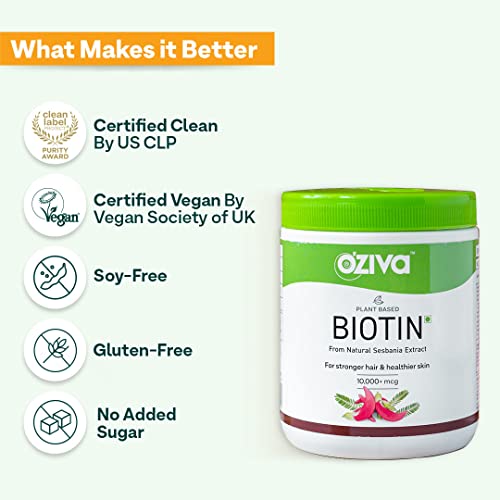 • HAR TARAH SE BETTER WITH CLEAN & PLANT-BASED PRODUCTS: OZiva Plant Based Biotin is a soy-free and gluten-free biotin that contains no added sugar or artificial sweeteners making it absolutely safe for long term consumption. It is 100% natural and is Certi