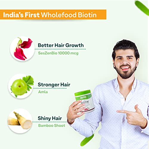 • WHOLEFOOD BIOTIN SUPPLEMENT FOR HAIR GROWTH: OZiva Plant Based Biotin for hair contains 10000 mcg of 100% natural Biotin derived from Sesbania Agati extracts. The proprietary blend of SesZenBio in this Biotin helps stimulate hair follicles up to 2 times t