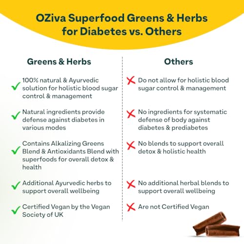 • Control Blood Sugar with OZiva Superfood Greens & Herbs Diabetes & Prediabetes: OZiva Superfood Greens & Herbs Diabetes and Prediabetes contains 5 Sugar Control Herbs including Gymnema Sylvestre Jamun seeds Spinach Moringa Milk Thistle to help in either r