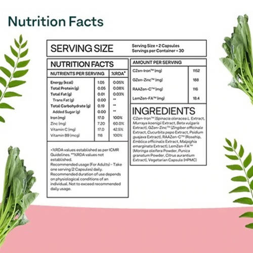 OZiva Plant Based Bettr. Iron+ CapsulesDirections of use:Take 2 capsules daily before bedtime.For at least 3-6 monthsLegal Disclaimer: Statements regarding dietary supplements have not been evaluated by the FDA.Note: Product images are for illustrative purposes only. Images/packaging/ labels may vary from time to time due to changes made by the manufacturer's manufacturing batch and location. The product description is for